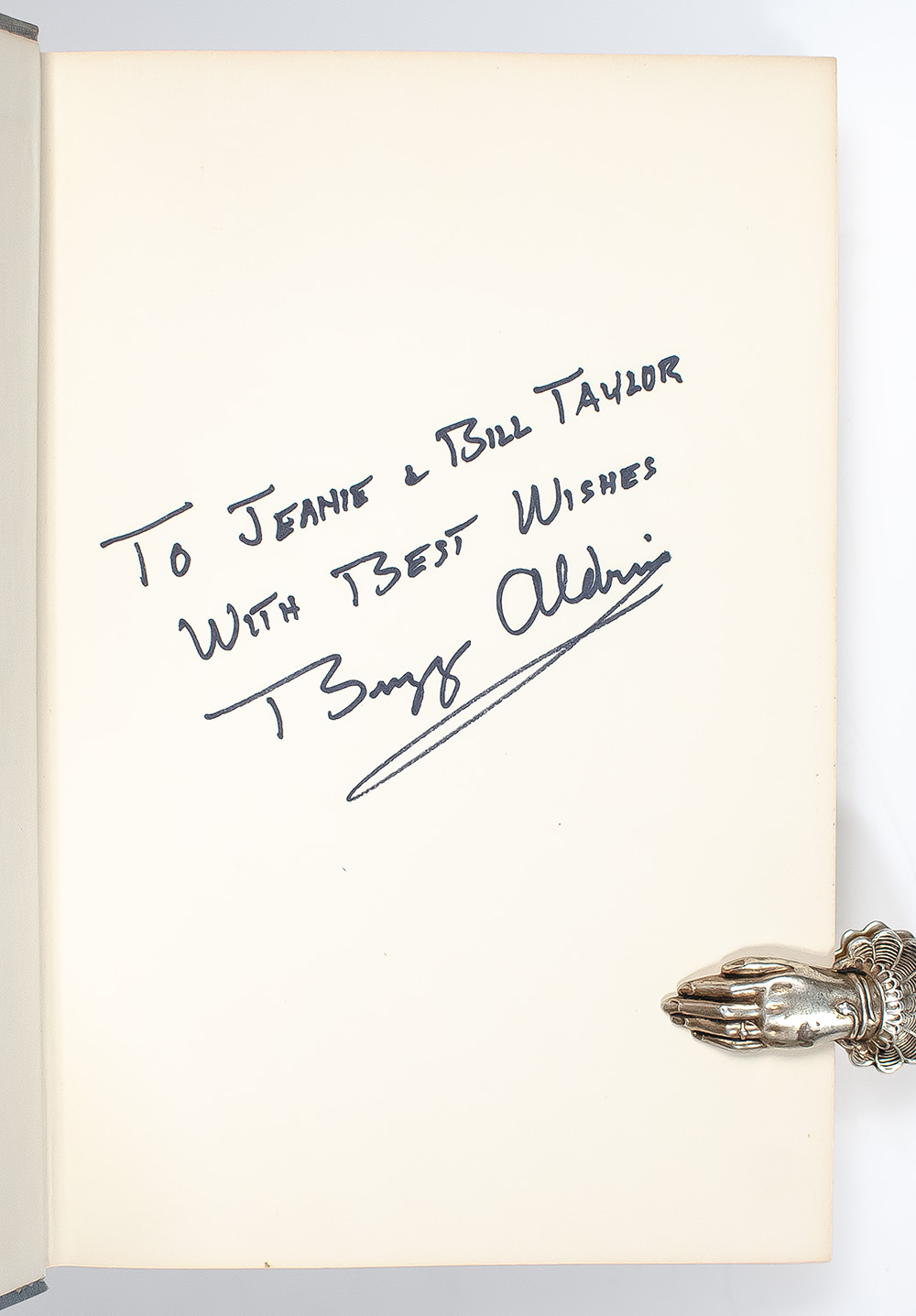 First edition of this work by the second man to walk on the moon. Octavo, original half cloth, illustrated with black and white photographs. Presentation copy, inscribed by Buzz Aldrin on the front free endpaper, "To Jeanie & Bill Taylor, with best wishes, Buzz Aldrin." Very good in a good dust jacket. Jacket design by Robert Aulicino. Written with Wayne Warga.