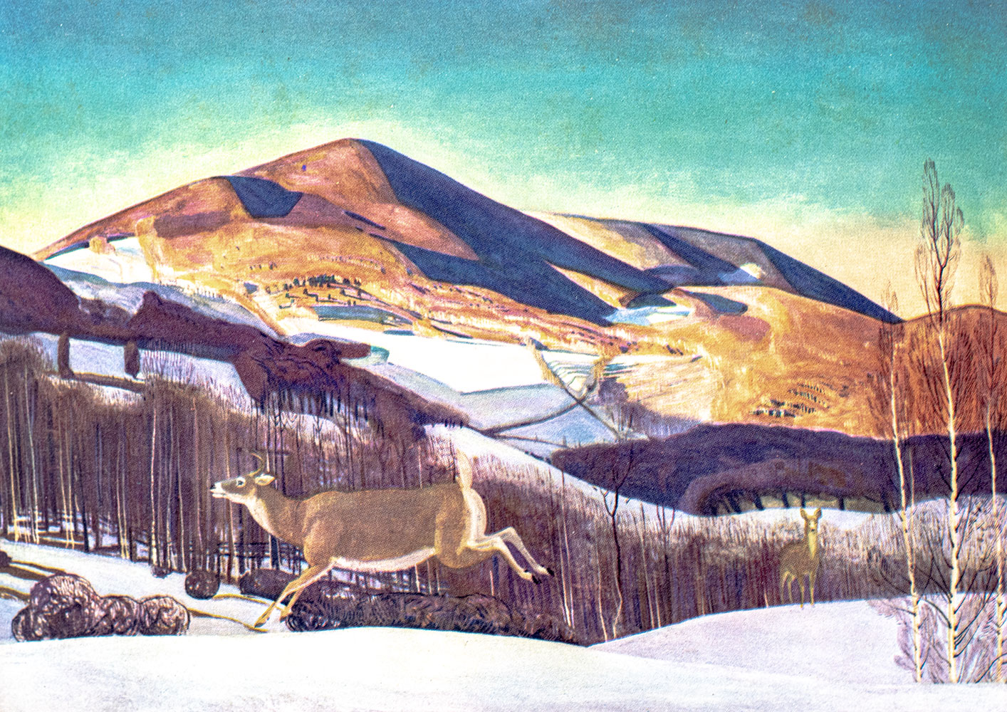 A transcendentalist and mystic in the tradition of Thoreau and Emerson, whose works he read, American artist, writer, and adventurer and voyager Rockwell Kent found inspiration in the austerity and stark beauty of the wilderness. Kent's early paintings of Mount Monadnock and New Hampshire were first shown at the Society of American Artists in New York in 1904, when Dublin Pond was purchased by Smith College. In 1905 Kent ventured to Monhegan Island, Maine, and found its rugged and primordial beauty a source of inspiration for the next five years. His first series of paintings of Monhegan were shown to wide critical acclaim in 1907 at Clausen Galleries in New York. These works form the foundation of his lasting reputation as an early American modernist, and can be seen in museums across the country, including the Metropolitan Museum of Art, Seattle Art Museum, New Britain Museum of American Art, and the Fine Arts Museums of San Francisco.