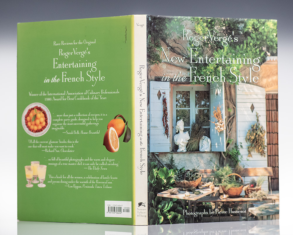 First edition of this cookbook by "the chef of the century" that presents an elegant yet approachable vision of French hospitality. Quarto, publisher's original pictorial boards, pictorial endpapers, illustrated throughout. Presentation copy, warmly inscribed in by Roger Vergé on the half-title page, "To Roberta I wish you a success for your students and your self for the school. Roger Vergé." Fine in a fine dust jacket. Photography by Pierce Hussenot. Food styling by Laurence Mouton. In collaboration with Adeline Brousse. Stamp to the verso of the front free endpaper, "From the Culinary Library of Cat Cora."