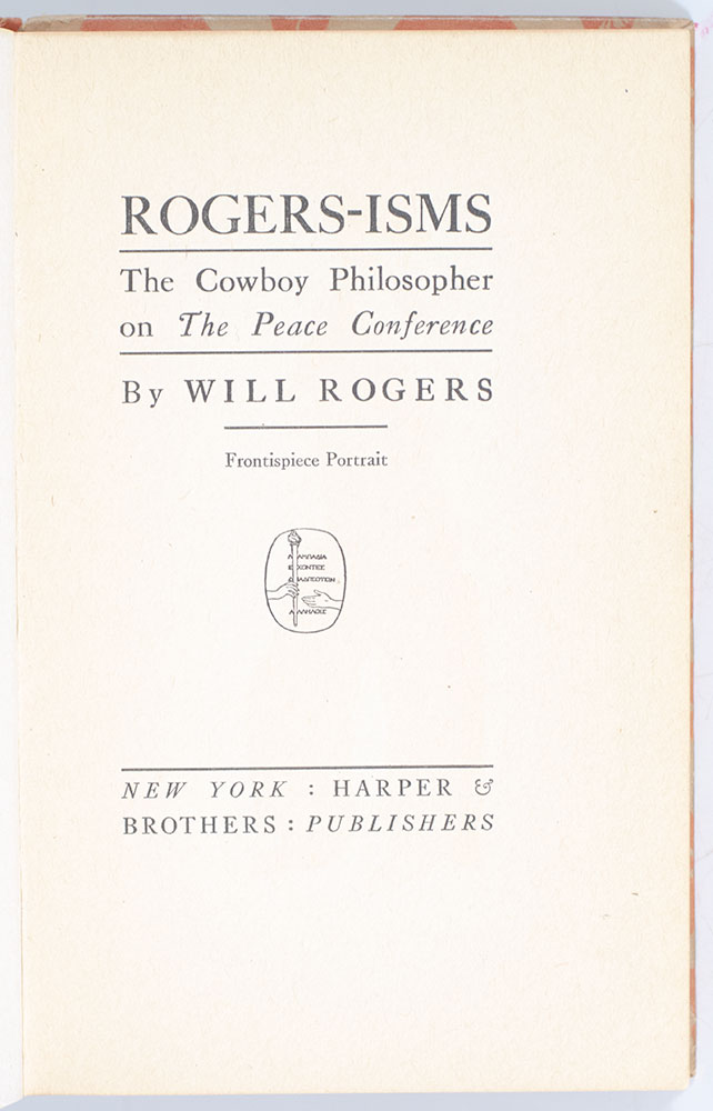 First edition of Will Rogers' Rogers-isms: The Cowboy Philosopher on The Peace Conference; signed by him