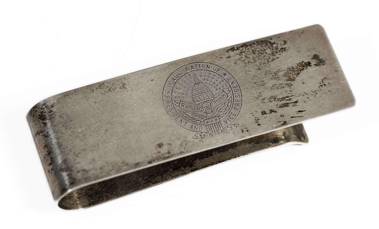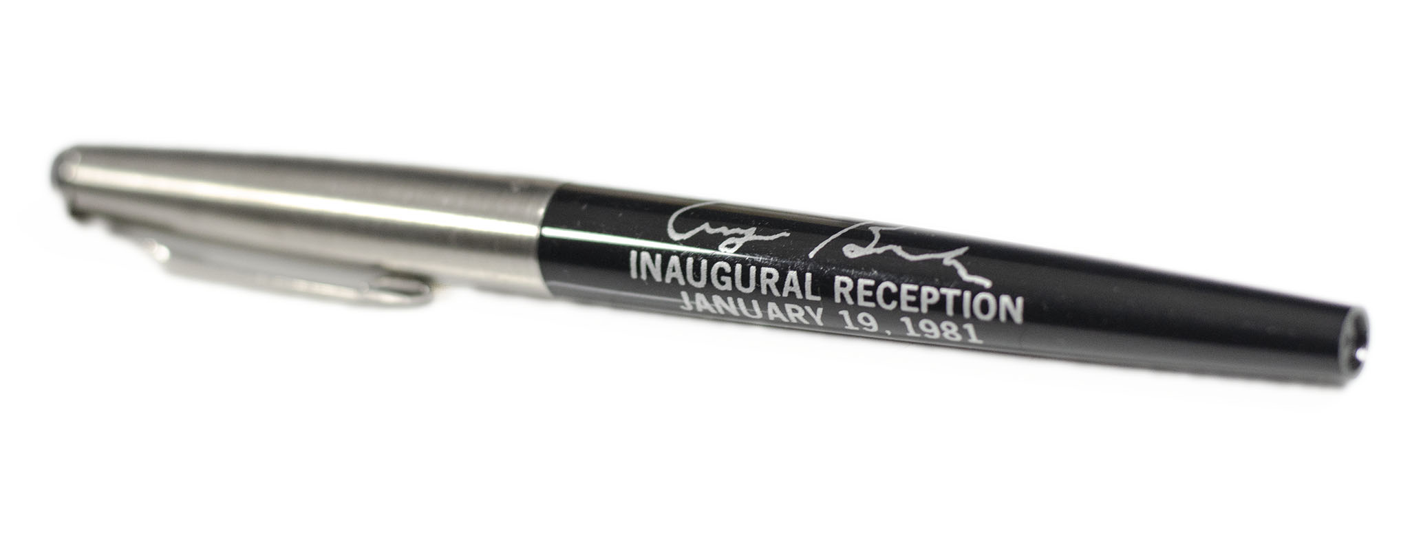 Fine collection of official gifts from the inauguration of Ronald Reagan as President and George H. W. Bush as Vice President of the United States. The collection includes a sterling silver money clip and pill box embossed with the Reagan Bush inaugural logo and a fountain pen from the inaugural reception of George H. W. Bush bearing Bush’s signature in facsimile and housed in the original box bearing the seal of the Vice President of the United States. In near fine condition.