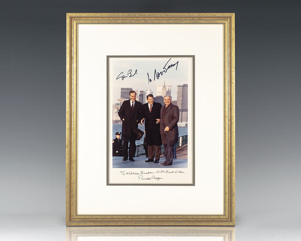 Photograph of President Reagan and then-President-elect George H.W. Bush, meeting with General Secretary Gorbachev on Governor's Island in December 1988. Inscribed by Ronald Reagan, "To William Linham- With Best Wishes. Ronald Reagan." Additionally signed by George H.W. Bush and Secretary-General Mikhail Gorbachev. In fine condition. Double matted and framed. The entire piece measures 19.5 inches by 15.5 inches. Rare and desirable.