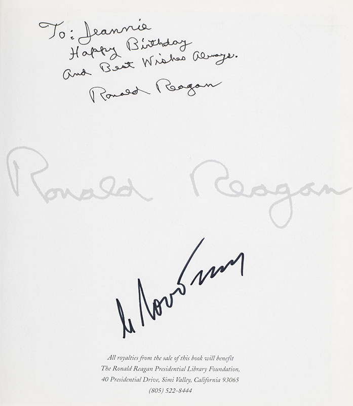 First edition of this compilation of speeches from the 40th President of the United States. Octavo, original half cloth, illustrated throughout. Presentation copy, inscribed by Reagan on the half-title page, "To Jeannie Happy Birthday and Best Wishes Always Ronald Reagan." Additionally signed by Mikhail Gorbachev on the half-title page. Fine in a fine dust jacket. Edited by Frederick J. Ryan, Jr. Rare and desirable signed by these two heads of states.