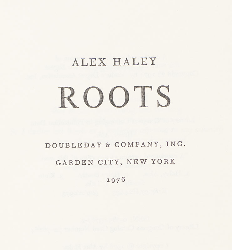 First edition of Haley's classic work. Octavo, original half cloth. Presentation copy, inscribed by the author on the front free endpaper, "March 11, 1977 To John Rockefeller III- very warm wishes to you and your family from one family of Kunta Kinte! Alex Haley. The recipient John Rockefeller III was a philanthropist and third-generation member of the Rockefeller family. He was the eldest son of the philanthropists John D. Rockefeller Jr. and Abby Aldrich Rockefeller. Like his sister Abby, John III eventually settled on philanthropy as his major interest. His brothers Nelson and Winthrop devoted themselves to politics while Laurance went into conservation and David went into banking. He was a major force behind the establishment of the Council on Foundations, the Foundation Center and Independent Sector. He took a leading role in organizing the Commission on Foundations and Private Philanthropy (better known as the Peterson Commission) and the Commission on Private Philanthropy and Public Needs (better known as the Filer Commission). Near fine in a near fine dust jacket. Jacket design by Al Nagy.