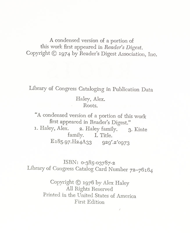 First Edition of Alex Haley's Roots; Inscribed by Him to John Rockefeller III