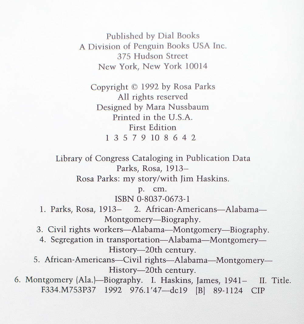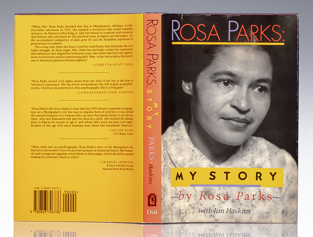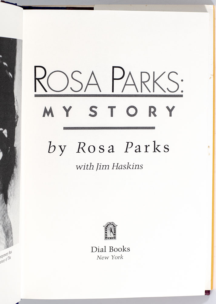 First edition of Parks' powerful autobiography. Octavo, original half cloth, illustrated. Boldly signed by the author in the year of publication on the title page, "3/15/92 Rosa Parks." Fine in a near fine dust jacket. Jacket design by Jane Byers Bierhorst. Written with Jim Haskins.