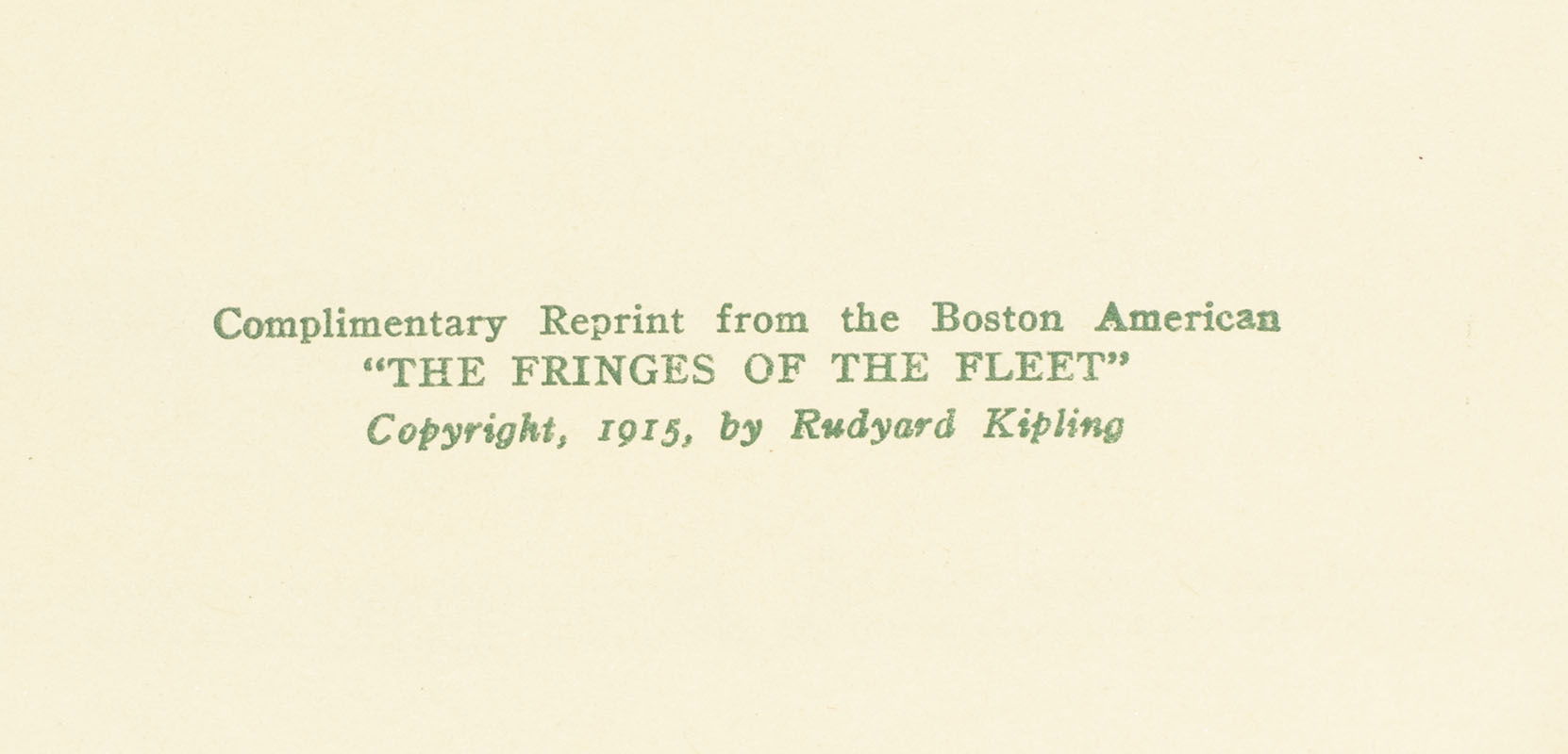 The Boston American's complimentary reprint of Kipling's Fringes of the Fleet which first appeared in England in The Daily Telegraph, and in the United States in the Hearst newspapers. Octavo, original pictorial wrappers. In near fine condition. Housed in a custom half morocco and chemise case. Rare.
