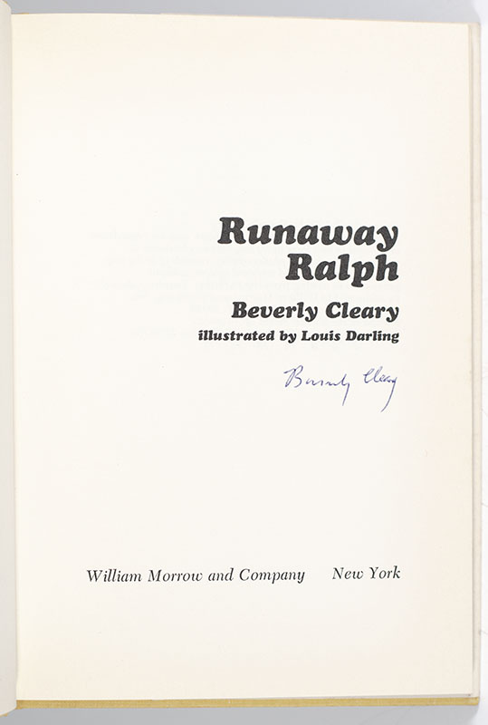 Early printing of the author's classic book. Octavo, original cloth, illustrated. Signed by Beverly Cleary on the title page. Near fine in a very good price-clipped dust jacket. Illustrated by Louis Darling. Uncommon signed.