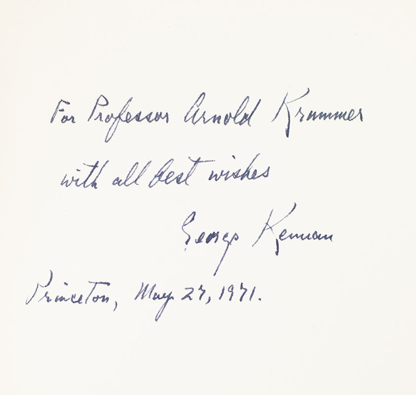 Early printing of this classic diplomatic history by one of the key architect of the United States' Cold War programs. Octavo, original cloth. Association copy, inscribed by the author to historian Arnold Krammer, "For Professor Arnold Krammer with all best wishes George Kennan Princeton, May 27, 1971." The recipient, Arnold Krammer was a historian who specialized in German and United States history and a professor at Texas A&M University in College Station, Texas. He was twice a Fulbright scholar in Germany in 1992-1993 and 2002-2003. He was the author of seven books, the most recent of which was War Crimes, Genocide, and the Law: Historical Perspective, published in 2009. He is a co-author of five other books and has penned scores of historical articles and book reviews in various learned journals, such as The Journal of Contemporary History, Slavic Review, The Russian Review, German Studies Review and Journal of Military History. Near fine in a near fine dust jacket with some rubbing to the extremities. Near fine in a near fine price-clipped dust jacket. Jacket design by Norman Law. An exceptional association copy.