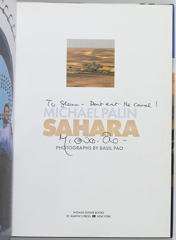 First edition of Palin's incredible retelling of his journey across the Sahara Desert. Quarto, original boards, patterned endpapers, photographs by Basil Pao. Presentation copy, inscribed by the author on the title page, "To Glenn - Don't eat the camel! Michael Palin." The recipient, Glenn Goldman founded Book Soup in 1975, an independently owned bookstore on Sunset Strip in West Hollywood specializing in art, music, film, photography, design and fiction. Fine in a near fine dust jacket. Cover design by Basil Pao.