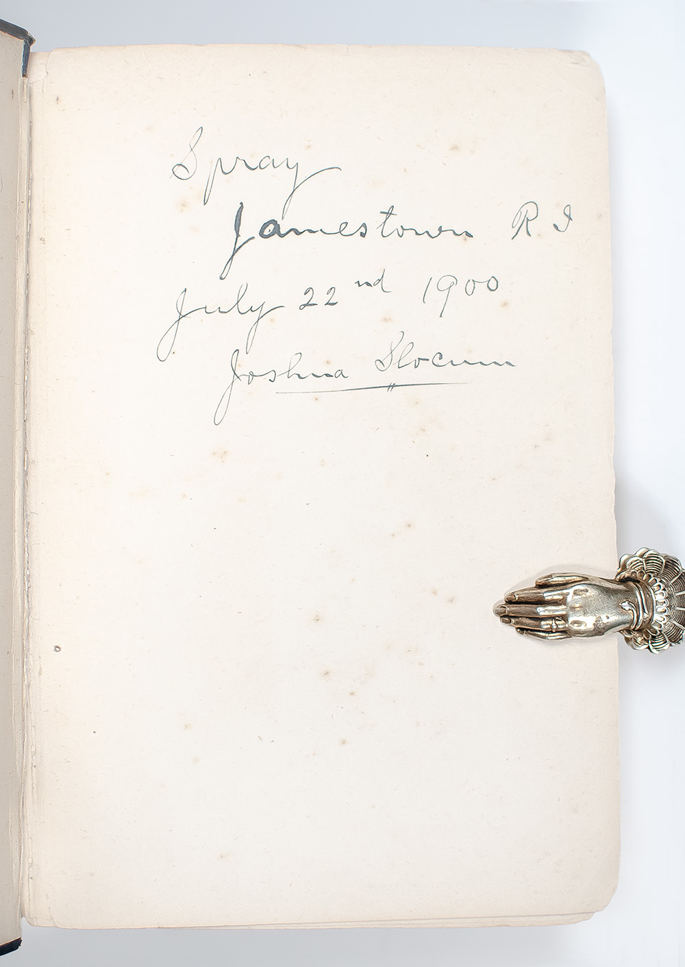 First edition of "the finest single-handed adventure story yet written" (Seafarer). Octavo, original blue cloth, pictorially stamped in silver and green, top edge gilt. Boldly signed by the author in the year of publication on the front free endpaper, "Spray New Jamestown July 22nd 1900 Joshua Slocum." In very good condition. Illustrated by Thomas Fogarty and George Varian. Signed first editions are rare.