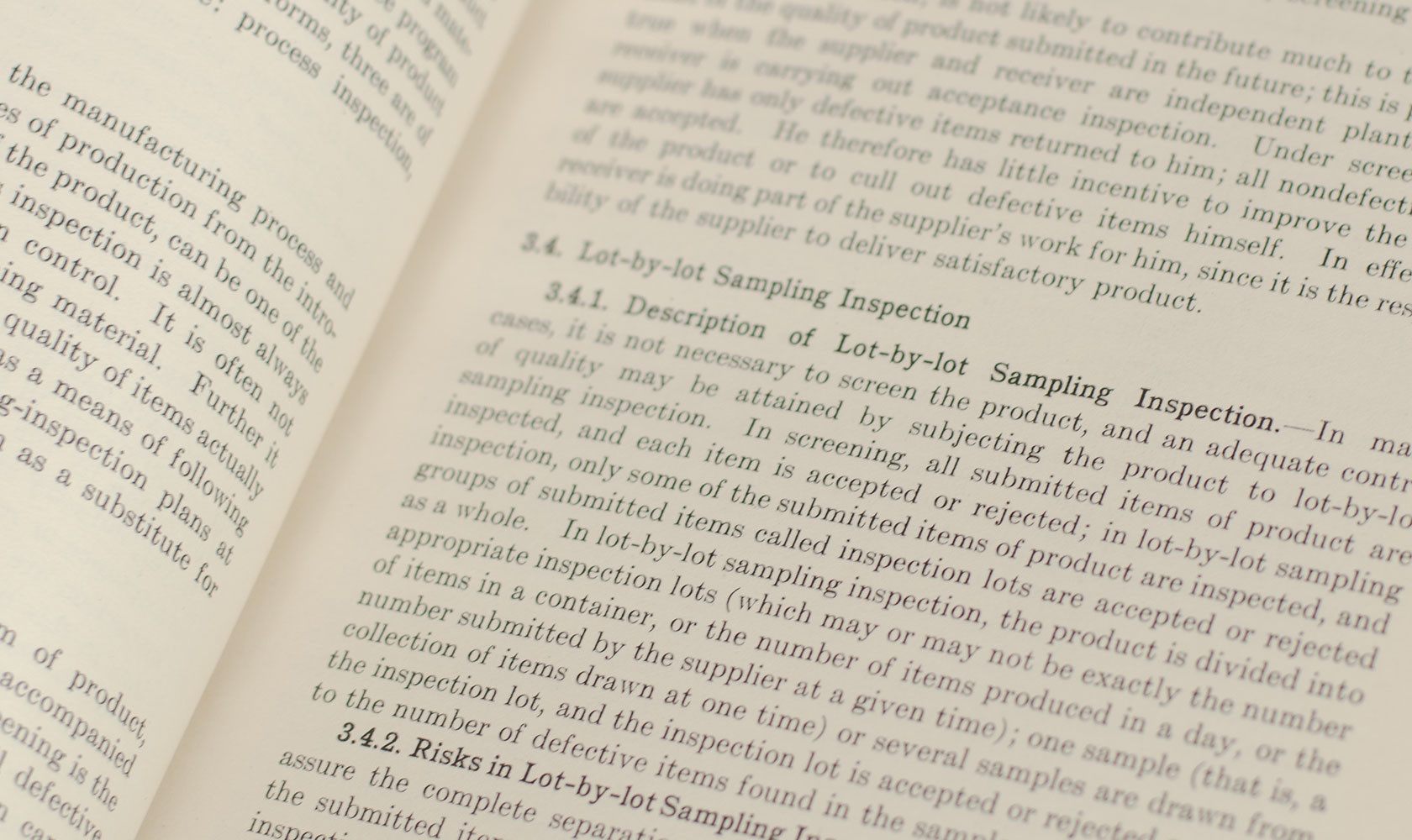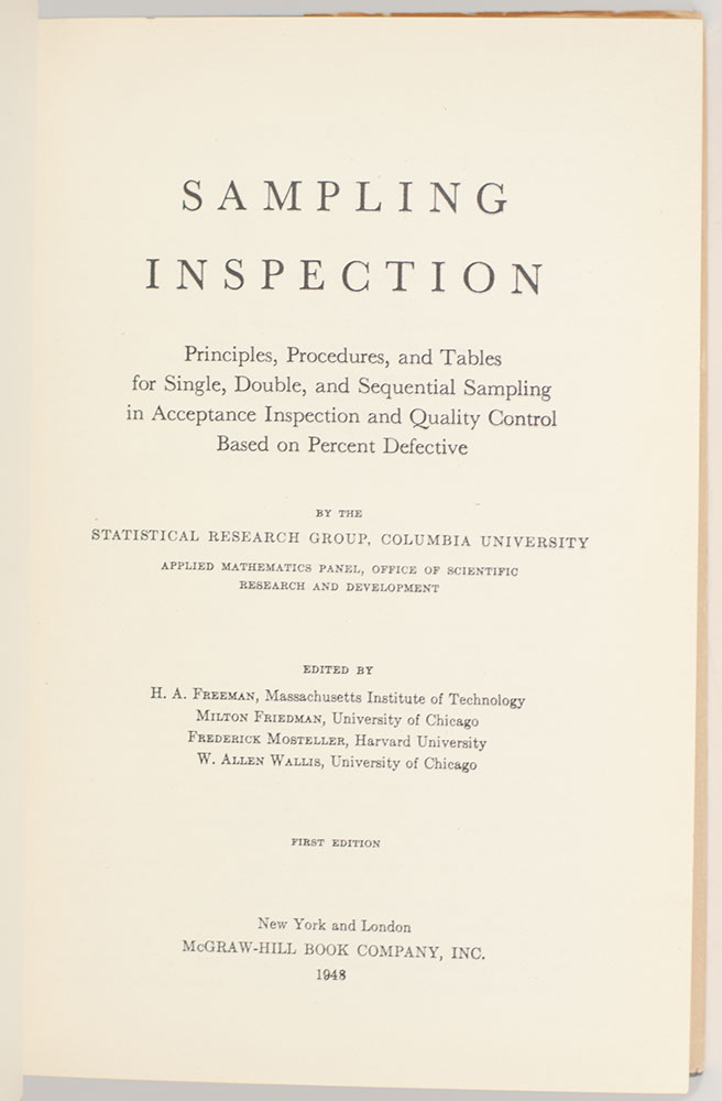 "An important activity at [the Statistical Research Group] was consulting with the military on procedures for inspecting batches of material submitted by suppliers to determine whether they met specification and should be accepted or rejected. Such acceptance inspection, and the closely related problem of inspecting samples of items coming off the production line to control quality, are of long standing, and standard procedures had been developed well before the war. The contributions of SRG were of two kinds. The first was simply to advise the military about relevant procedures and to assist in drafting manuals for various groups to use. The second was to improve the existing procedures. The development of sequential analysis and its application to specific problems was the main contribution of this kind. These activities led to a request that SRG prepare an inspection manual for the Navy. Because of the obvious peacetime importance of sampling inspection, the work we had done during the war was published after the war in a volume entitled Sampling Inspection: Principles, Procedures, and Tables for Single, Double, and Sequential Sampling in Acceptance Inspection and Quality Control Based on Percent Defective."