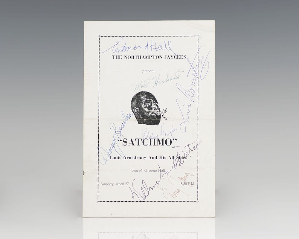 Rare original program from Louis Armstrong and His All Stars' performance at the John M. Greene Hall in Northampton Massachusetts during their All Star tour. Octavo, 6 pages. Boldly signed by Louis Armstrong on the program cover. Additionally signed by Clarinetist Ed Hall, Trombonist Trummy Young, Pianist Billy Kyle, Bassist Mort Herbert, and Vocalist Velma Middleton. In near fine condition. A unique example.