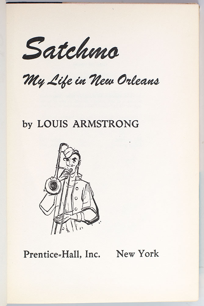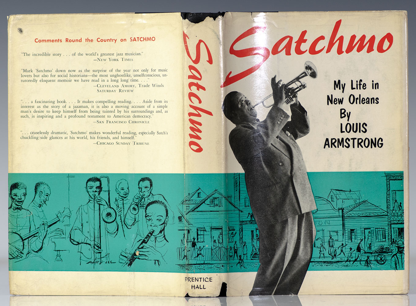 First edition, second printing of the autobiography of one of the most influential figures in the history of jazz, Louis "Pops" Armstrong. Octavo, original half cloth, pictorial endpapers, illustrated. Presentation copy, inscribed by the musician on the half-title page, "To Josh: The Old Dixie Jazz-hound from New Orleans!! Your friend, Louis Armstrong ("Satchmo")." The recipient, Joshua B. Glassel was a fellow Dixieland jazz musician and friend of Armstrong's in New Orleans. Near fine in a very good price-clipped dust jacket. With Glassel's ownership signature to the half-title page.