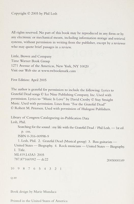 First edition of Lesh's autobiography. Octavo, original boards, pictorial endpapers, illustrated. Presentation copy, inscribed by Phil Lesh on the dedication page, "Glenn - Enjoy Phil Lesh." The recipient, Glenn Goldman founded Book Soup in 1975, an independently owned bookstore on Sunset Strip in West Hollywood specializing in art, music, film, photography, design and fiction. Fine in a near fine dust jacket. Jacket design by Gary Houston. Jacket illustration by Tina Carpenter.