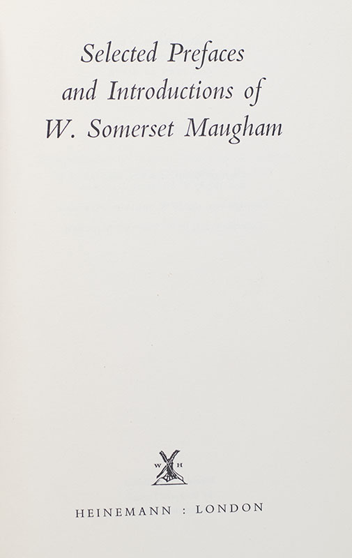 First edition of the selected prefaces and introductions of W. Somerset Maugham which offer insight into his views of the writer's craft. Octavo, original cloth. Near fine in a very good dust jacket. Jacket design by J. Bance.