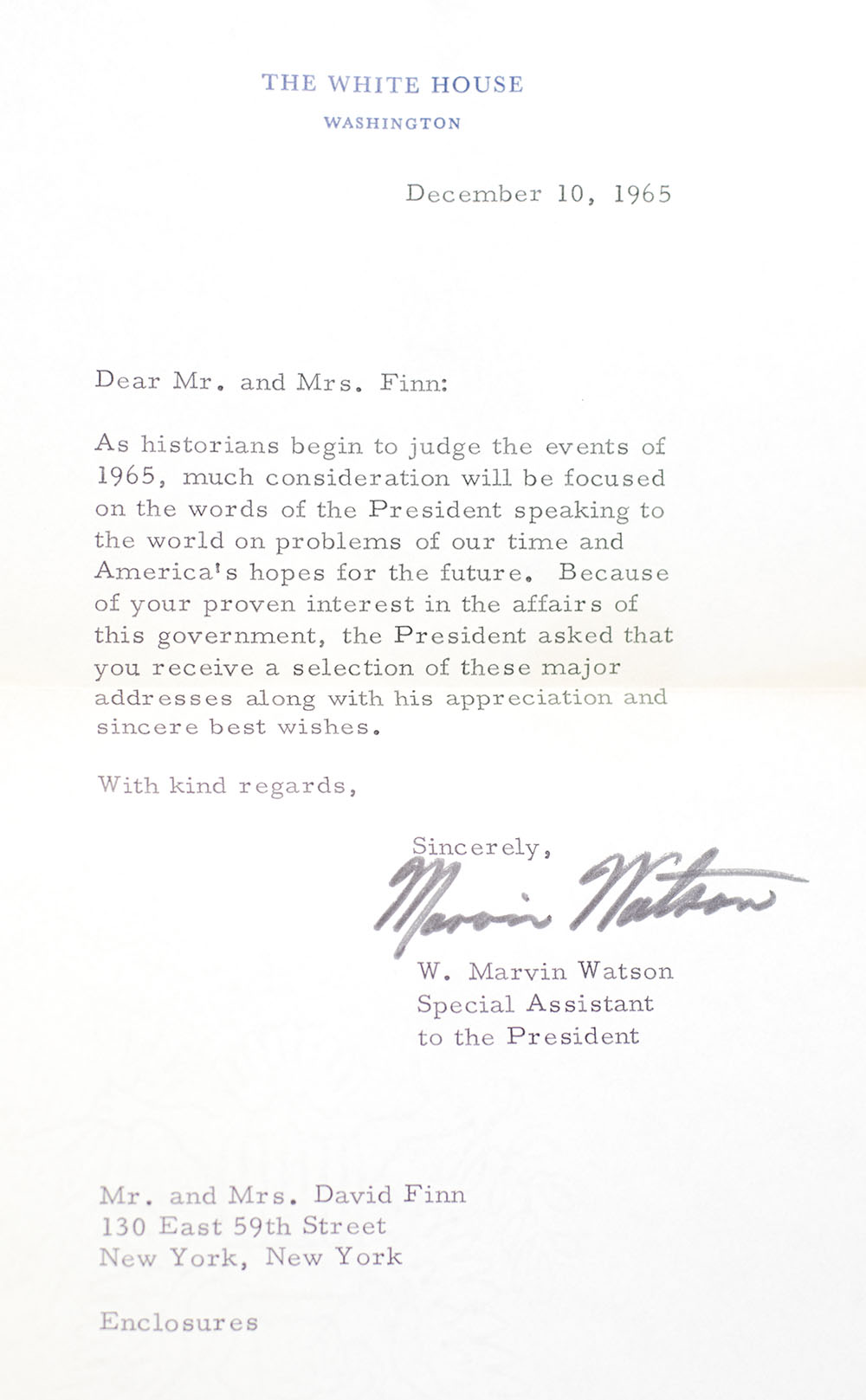 "I speak tonight for the dignity of man and the destiny of democracy": Rare first edition collection of Selected Presidential Addresses of Lyndon B. Johnson 1965; with a typed letter signed by Johnson's Special Assistant W. Marvin Watson
