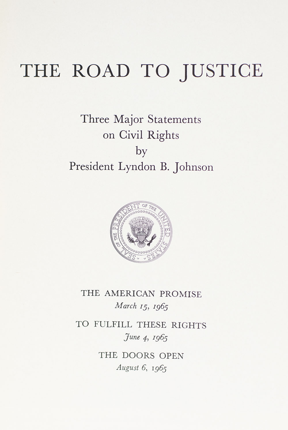 Fine collection of the major addresses of the 36th president of the United States, Lyndon B. Johnson. Octavo, 8 volumes, original wrappers. Laid in is a typed letter on White House letterhead signed by Johnson's Special Assistant W. Marvin Watson which reads in full: December 10, 1965 Dear Mr. and Mrs. Finn: As historians begin to judge the events of 1965, much consideration will be focused on the words of the President speaking to the world on problems of our time and America's hopes for the future. Because of your proven interest in the affairs of this government, the President asked that you receive a selection of these major addresses along with his appreciation and sincere best wishes. With kind regards, Sincerely, "Marvin Watson" W. Marvin Watson Special Assistant to the President. The collection includes a Foreword to the Selected Presidential Addresses, The Road to Justice: Three Major Statements on Civil Rights, Remarks of the President at National Cathedral School Washington D.C., Toward Peace with Honor, The Vital Alliance, State of the Union Message by the President to a Joint Session of the Congress, Remarks of the President at John Hopkins University Baltimore Maryland, and The Nobel Adventure: Remarks of the President at the Smithsonian Bicentennial Celebration. In fine condition. Housed in a custom slipcase.