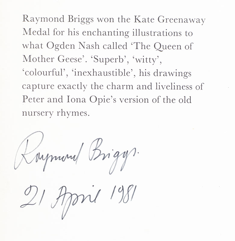 Fine collection of first editions and early printings with two signed by children's book author Raymond Briggs. Quarto, four volumes, original boards and wrappers, illustrated. The collection includes a Picture Puffin edition of The Mother Goose Treasury inscribed by the author (London: Picture Puffin, 1976), a Picture Puffin edition of Jim and the Beanstalk inscribed by the author (London: Picture Puffin, 1973), a first edition of Unlucky Wally (London: Hamish Hamilton, 1987), and a first edition of Ivor the Invisible (London, Channel 4 Books: 2001). Each volume is in near fine to fine condition.