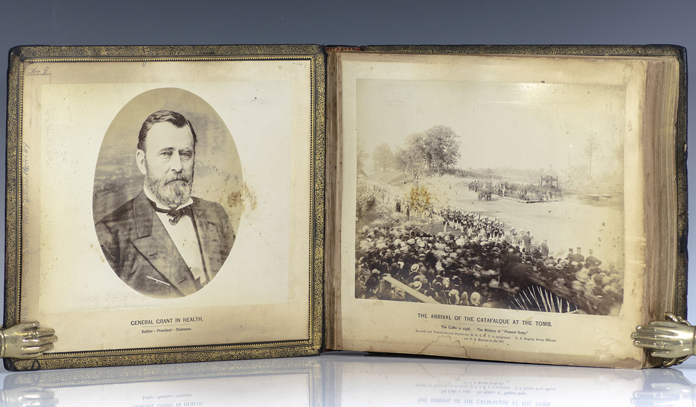 First edition of the spectacular album memorializing the life and elaborate funeral proceedings of General Ulysses S. Grant. Oblong folio, bound in the original publisher's full black morocco elaborately stamped in blind with gilt titles to the front panel, inner dentelles, containing 97 mounted albumen prints including the last known photograph of Grant taken four days before his death on July 19 1885, his sick-room and death-bed room at Mount McGregor, and numerous images of the impressive seven-mile grand funeral procession held in New York City featuring numerous military regiments and attended by throngs of admirers. The U.S. Instantaneous Photographic Co. firm produced several versions of the present album with varying numbers of prints for display in hotel lobbies on elaborate custom-made brass display stands. The present album contains more images than usually found, and is numbered "No. 9" on the front pastedown. In near fine condition. Exceedingly rare with only four copies listed with OCLC.