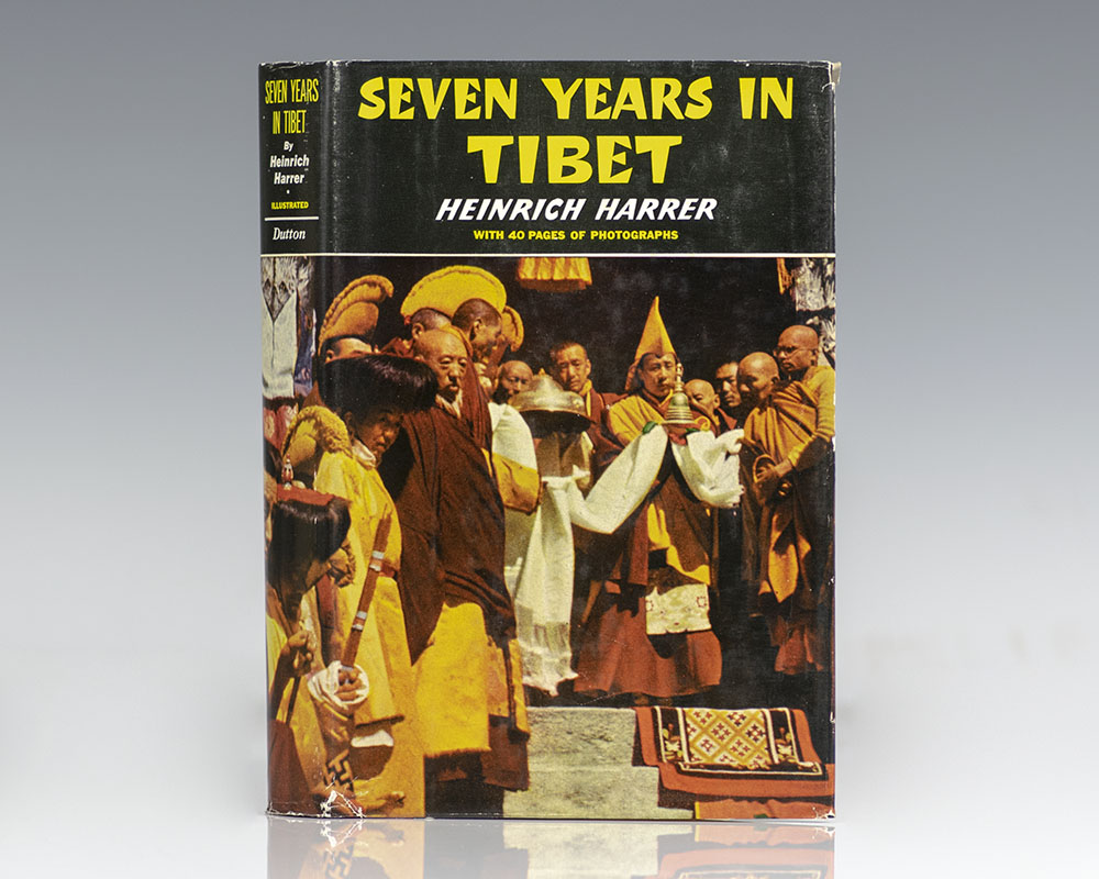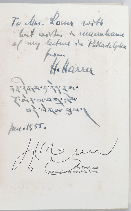 First American edition of Harrer's classic account, signed by Harrer and The Dalai Lama. Octavo, original half cloth, illustrated with over 40 photographs. Presentation copy, lengthily inscribed by Heinrich Harrer in both English and Tibetan on the half-title page, "To Mrs. Rosser with best wishes in remembrance of my lecture in Philadelphia from H. Harrer Jan. 1955." Additionally signed by His Holiness The Dalai Lama, who was tutored by Harrer while he living in Tibet. Near fine in a near fine dust jacket. Translated by Richard Graves. Housed in a custom half morocco clamshell box. Rare and desirable signed by both Harrer and The Dalai Lama.
