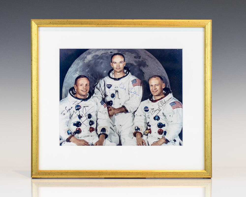 NASA color photograph from the May 1969 press release printed on verso, showing the astronauts in space suits without helmets, the moon in the background. Boldly signed by Neil Armstrong, Michael Collins and Buzz Aldrin. Matted and framed.