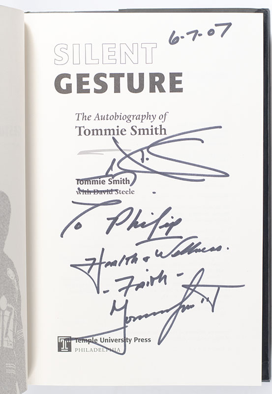 First edition of this powerful autobiography by the Olympic gold medalist. Octavo, original half cloth. Presentation copy, inscribed by the author on the title page in the year of publication, "6-7-07 To Philip Health and Wellness. Faith Tommie Smith." Fine in a near fine dust jacket. Jacket design by Kate Nichols. Written with David Steele.
