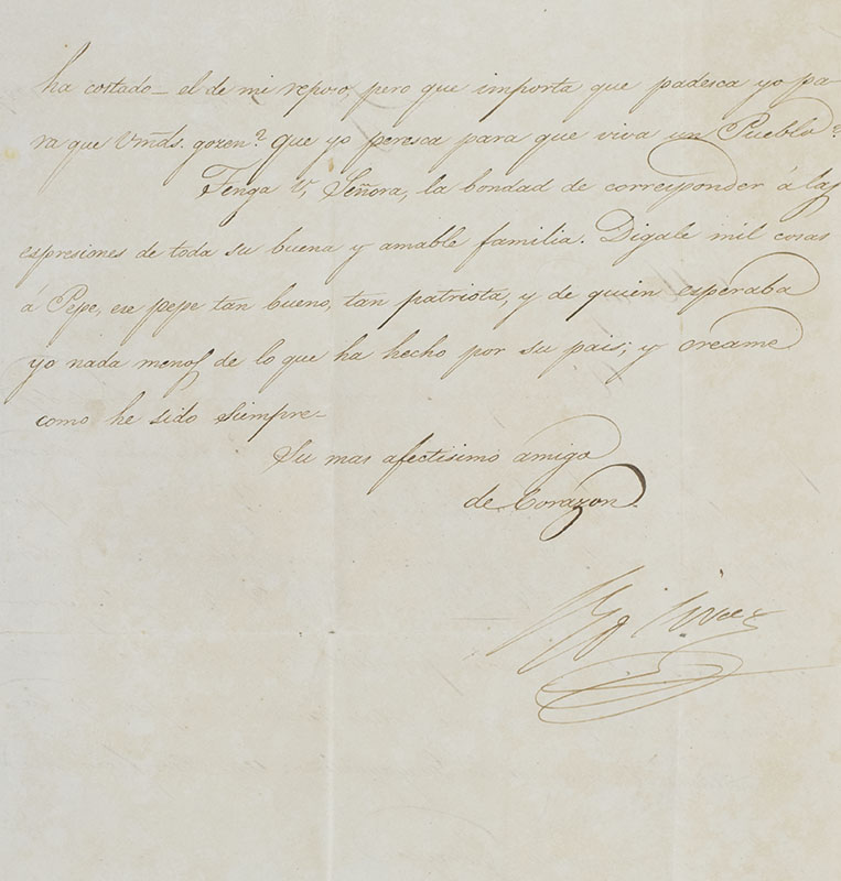 Rare autograph letter signed by 'El Libertador', Simón Bolívar as President of Gran Colombia. One page, script in Spanish. Sent from Bogota, the letter is dated December 6, 1827 and reads in full, "A la Senora Manuela Garaycoa. Umd. siempre se eccele a si misma on bondades para conmigo y me prodiga elofios ques ellos solo, bastarian para saviar la codica del mas ambivioiso de gloria. Y que otra cora podria yo esperar de las Garaycoas de esas amigas fieles de esas Colombians constantes de esa Gloriosa sin rival? Yo les doy las gracias a todas y seame tambien permitido congratulamme a mi mismo, ya que e algun modo be podidos sustitur la paz y la tranquilidad al corazon de los Guayaquilenos un sacrificio me ha cortado - el de mi reposo, pero que importa que paderca yo para que umds. gozen? Que yo peresac para que viva un Puebla? Tenga v, Senora, la bondad de coreesponder a las espreciones de toda su buena y amable familia. Digale mil cosas a Pepe, ese pepe tan bueno, tan patrista, y de quien esperaba yo nada menof de lo que ha hecho por su pais, y creame como he sido diempre. Su mas afectisimo amigo de corazon. Simón Bolívar" which translates into English as, "To Senora Manuela Garaycoa. My friend, who always shows kindness to me and lavishes praise on me that they alone would suffice to savor the greed of the most ambivalent of glory. And what other heart could I expect from the Garaycoas of those? Faithful friends of those constant unrivaled Glorious Colombians? I thank you all and let me also congratulate myself, since in some way I have been able to substitute the peace and the tranquility to the heart of the Guayaquilenos, a sacrifice has made me cut off - that of my rest, but what does it matter what I suffer for you to enjoy? That I perish for a people to live? Have you, Senora, the kindness to respond to the expectations of all your good and kind family, tell a million things to Pepe, so good... and from whom I expected nothing less than what he has done for his country, and believe me as I have always been. His most affectionate friend at heart. Simón Bolívar. " The recipient, Manuela Garaycoa was an Ecuadorian independentista. She participated in the anti-colonial struggle in the second war of independence and, despite the death of her son Abdón Calderón at a young age in battle, maintained a strong bond with the independence struggle and frequently corresponded with Antonio José de Sucre and Simón Bolívar. In near fine condition. With a portrait of Bolivar.
