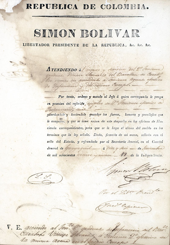 RARE MILITARY APPOINTMENT SIGNED BY 'EL LIBERTADOR', SIMÓN BOLÍVAR AS PRESIDENT OF GRAN COLOMBIA