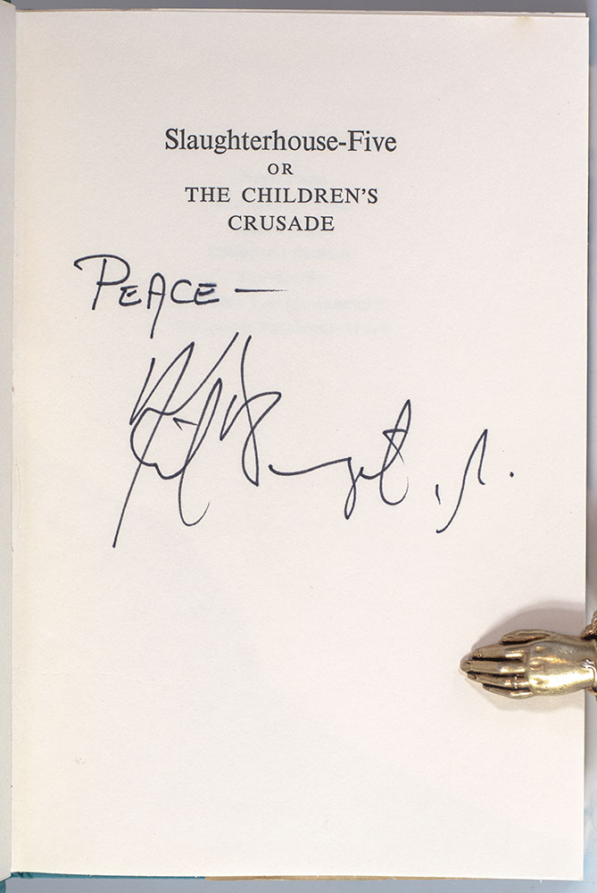 First edition of Vonnegut's masterpiece. Octavo, original blue cloth. Boldly signed by the author on the half-title page in a contemporary hand, "Peace Kurt Vonnegut Jr." Fine in a near fine dust jacket. Jacket design by Paul Bacon. Housed in a custom clamshell box. An exceptional example.
