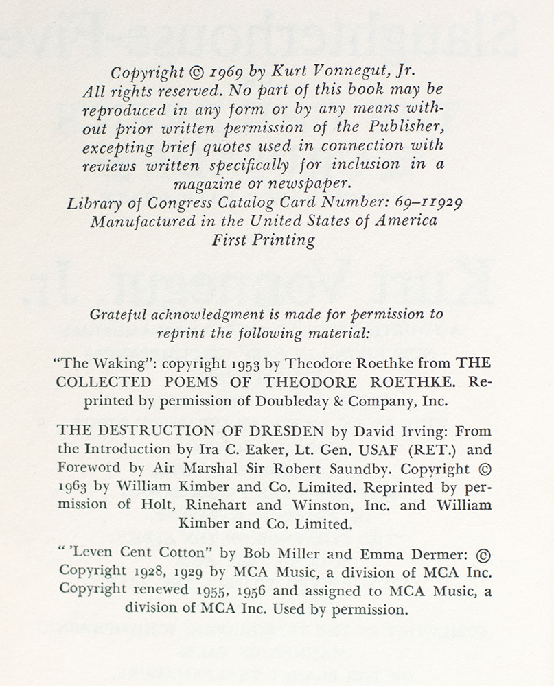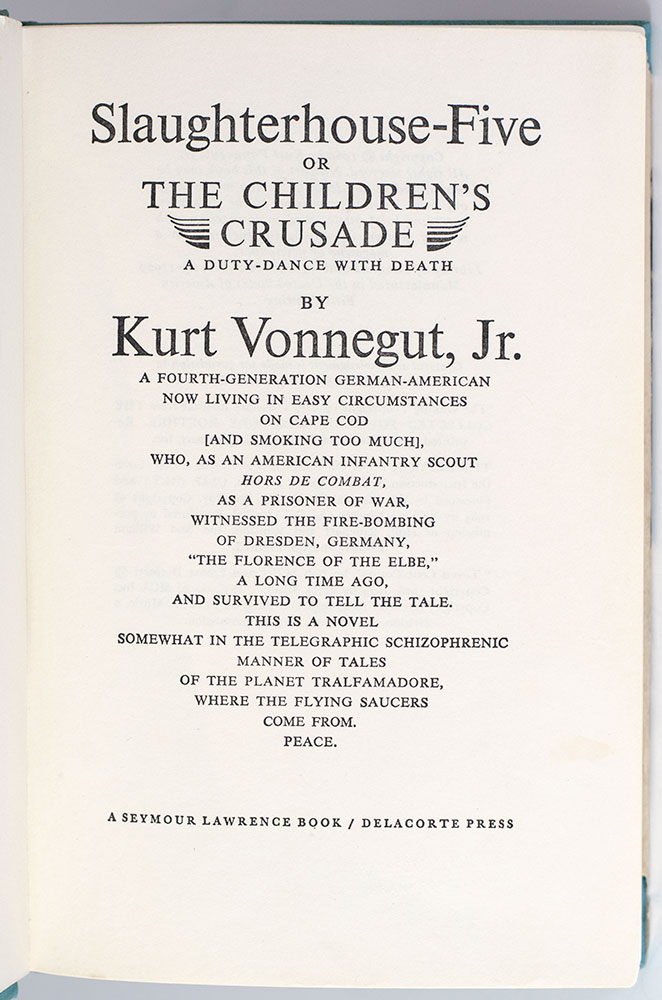 “All moments, past, present and future, always have existed, always will exist": First Edition of Slaughterhouse-Five; Signed by Kurt Vonnegut