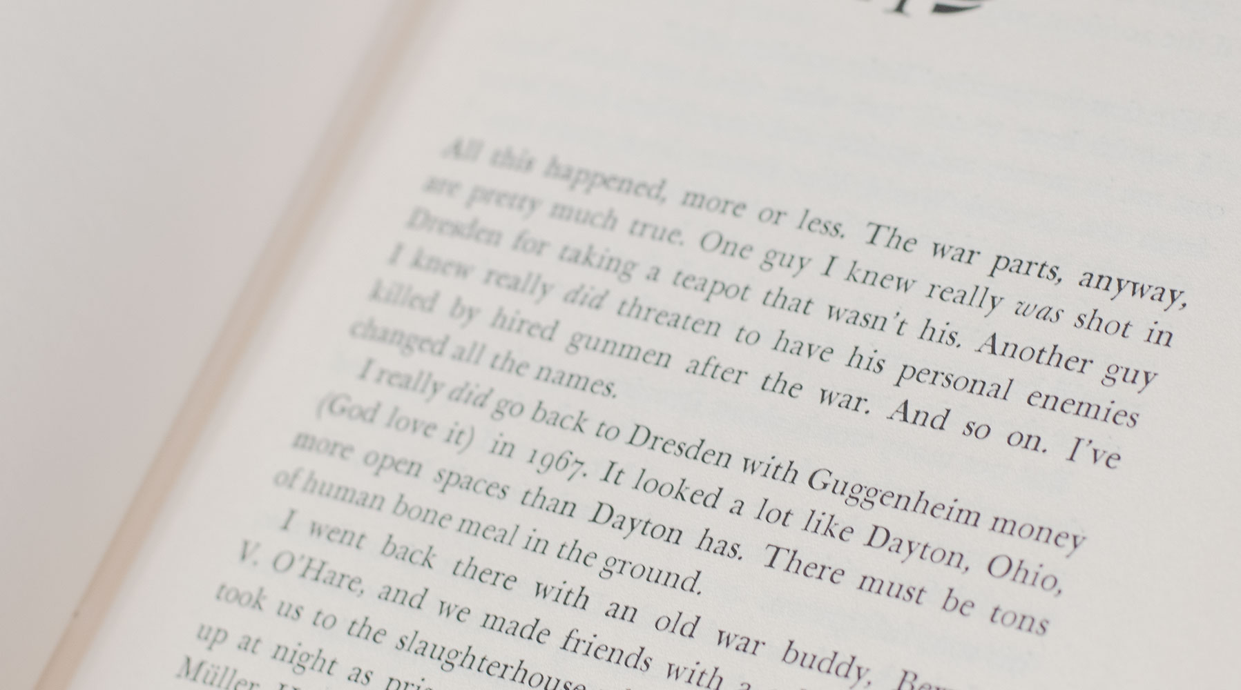 "Slaughterhouse-Five, perhaps Vonneguts most powerful novel, presents two characters who can see beneath the surface to the tragic realities of human history but make no attempt to bring about change The central event is the destruction of Dresden by bombs and fire storma catastrophe that Vonnegut himself witnessed as a prisoner of war" (Vinson, 1414-15). "Kurt Vonnegut knows all the tricks of the writing game. So he has not even tried to describe the bombing. Instead he has written around it in a highly imaginative, often funny, nearly psychedelic story. The story is sandwiched between an autobiographical introduction and epilogue" (The New York Times). It is the basis for the 1972 film bearing the same name. The screenplay written by Stephen Geller and directed by George Roy Hill. It stars Michael Sacks, Ron Leibman, and Valerie Perrine, and features Eugene Roche, Sharon Gans, Holly Near, and Perry King.