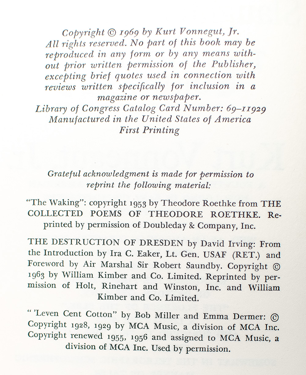 First edition, review copy with the original publisher's slip laid in of Vonnegut's masterpiece, named by Modern Library as one of the 100 greatest novels of the twentieth century. Octavo, original blue cloth. Boldly signed and dated by Kurt Vonnegut with a drawing of a self-caricature on the half-title page. Near fine in a fine dust jacket with a unique jacket that has been mistriked bearing a duplicate look on the verso. Jacket design by Paul Bacon. A unique example, one of the nicest we have seen.