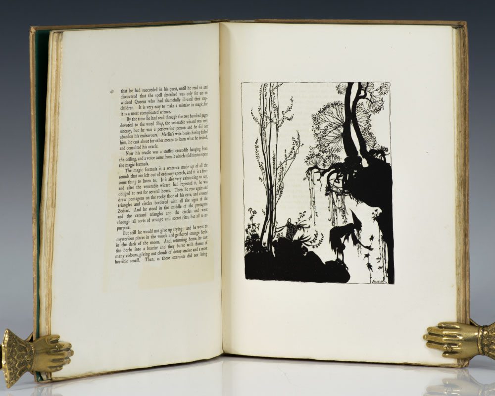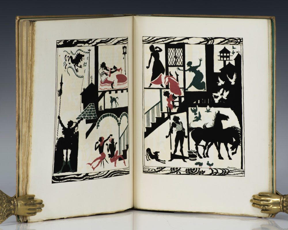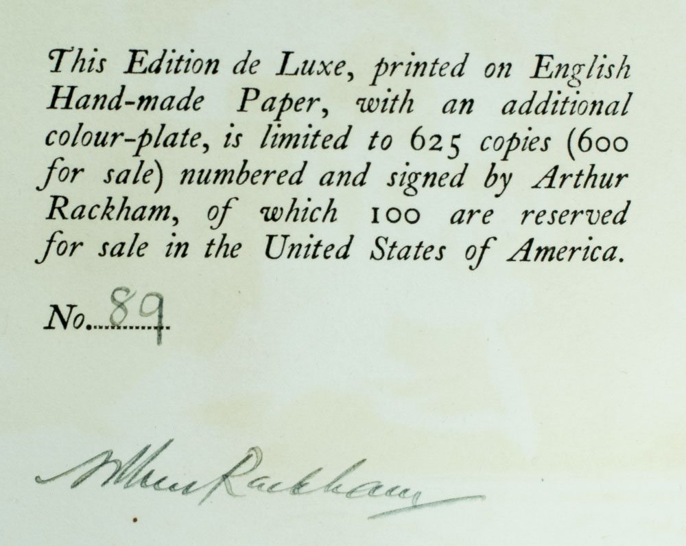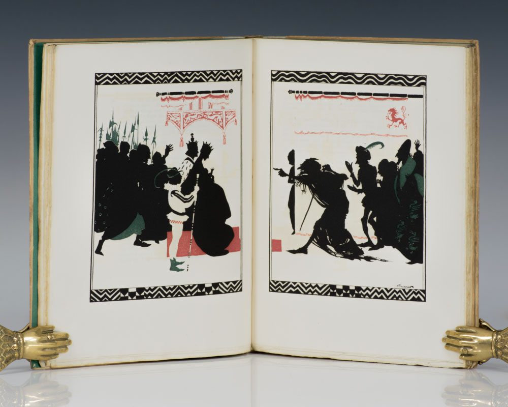 Signed limited deluxe edition. Quarto, original half vellum over cream boards, pictorial endpapers, top edge gilt. One of 625 numbered copies signed by the illustrator Arthur Rackham. Printed on English hand-made paper with an additional color plate. Illustrations: 25 full page silhouettes, comprising 9 in color (frontispiece and 4 double plates)--and 16 in black (including 4 double illustrations); one mounted colored plate; silhouette head- and tail-pieces and other silhouettes throughout the text, in black. In very good condition.