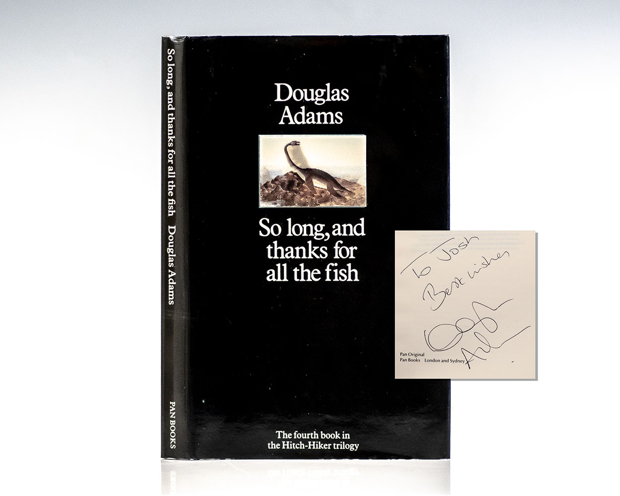 First edition of the fourth book in Adams' Hitch-Hiker series. Octavo, original boards. Presentation copy, inscribed by Douglas Adams on the title page, "To Josh Best wishes Douglas Adams." Fine in a fine dust jacket. Jacket design by Gary Day-Ellison.