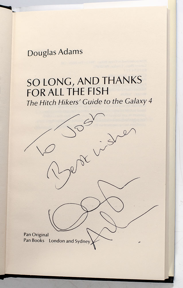 "God's Final Message to His Creation: 'We apologize for the inconvenience'”: First Edition of Douglas Adams' So Long, and Thanks for All the Fish; Signed by Him
