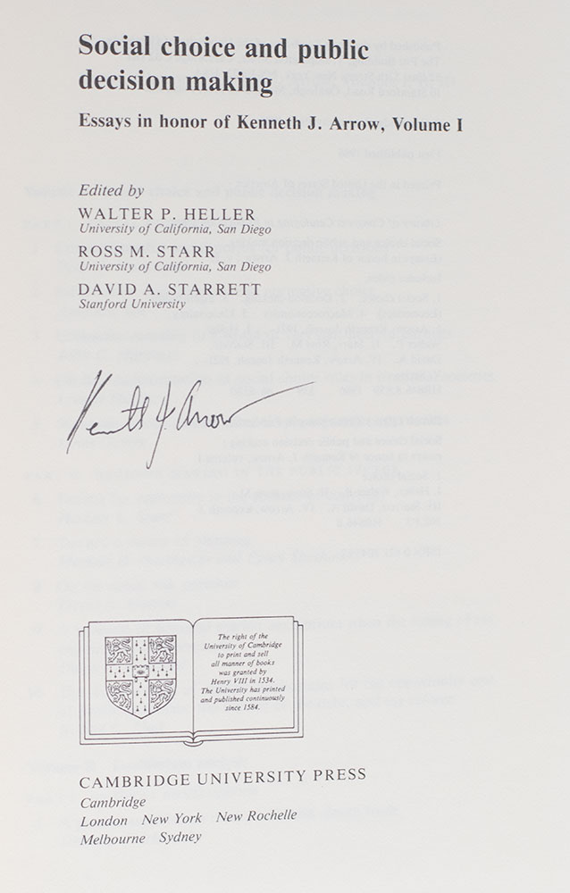 First editions of these essays in honor of the economist Kenneth Arrow. Octavo, 2 volumes, original cloth. Boldly signed by Kenneth Arrow in both volumes one and two on the title page. Fine in a near fine dust jackets. Edited by Walter P. Heller, Ross M. Starr and David A. Starrett.