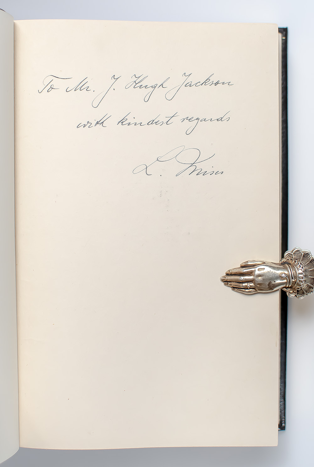 First edition of the new edition of this "work on political economy in the tradition of the great moral philosophers, a Montesquieu or Adam Smith, containing both acute knowledge and profound wisdom by von Mises" (F.A. Hayek). Octavo, bound in full morocco by the Harcourt Bindery with gilt titles and tooling to the spine in six compartments within raised gilt bands, gilt ruling to the front and rear panel, gilt inner dentelles stamp-signed by the Harcourt Bindery, marbled endpapers, all edges gilt. Presentation copy, inscribed by the author, "Mr. J. Hugh Jackson with kindest regards L. Mises." In near fine condition, Stanford University Library stamp to the title page with marginalia throughout. An interesting provenance as many exceptional economists have come out of Stanford and went on to win the Nobel Prize. An exceptional presentation, with noted provenance.