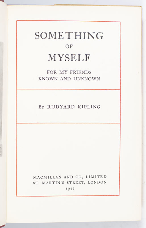 First edition of Kipling's autobiography. Octavo, original cloth, frontispiece. Fine in a near fine dust jacket.