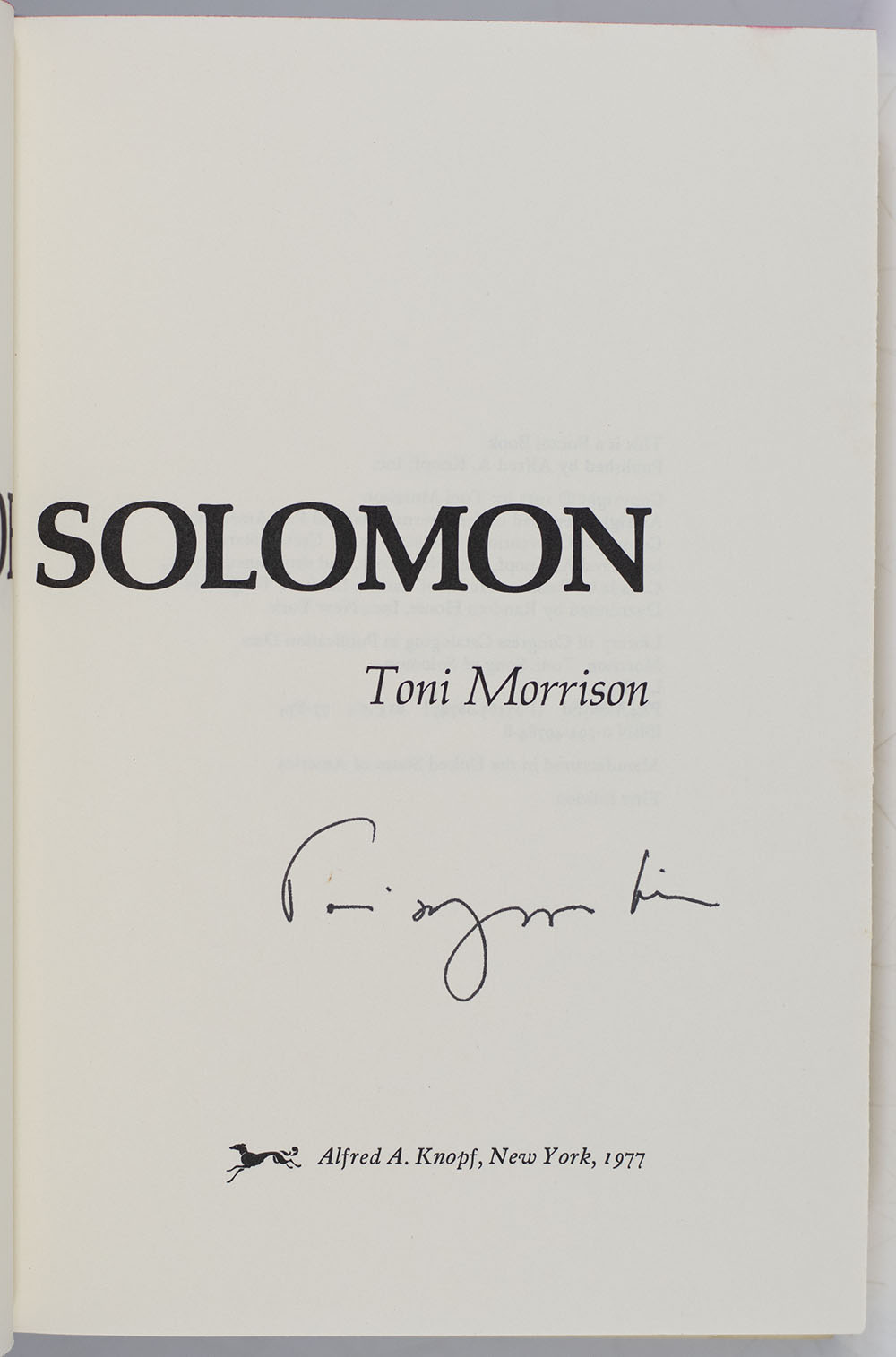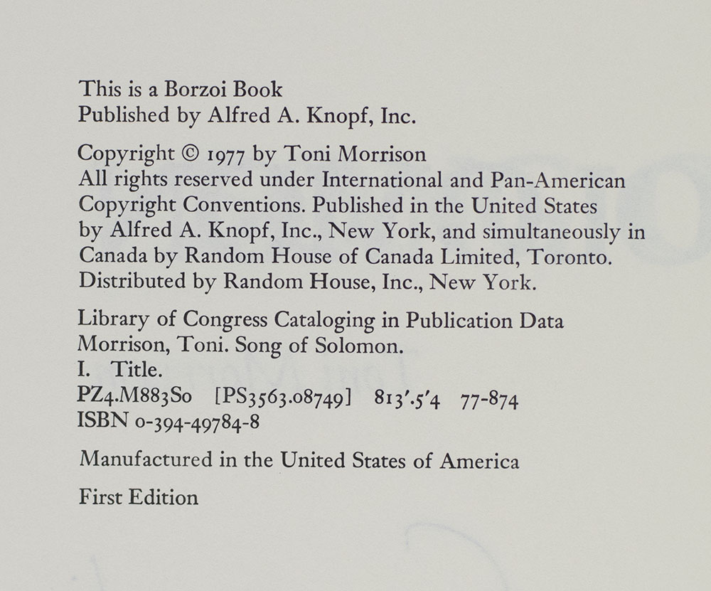 "If you surrendered to the air, you could ride it”: First Edition of Song of Solomon; Signed by Nobel Prize-Winning Author Toni Morrison