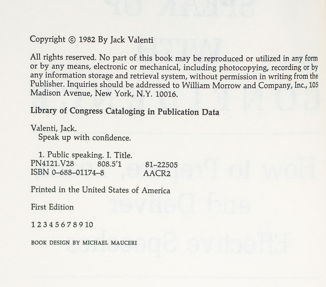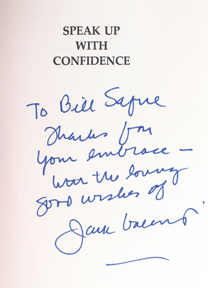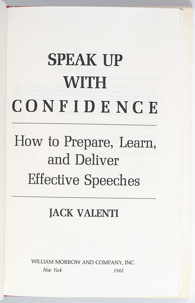 First edition of Jack Valenti's Speak Up With Confidence: How to Prepare, Learn, and Deliver Effective Speeches; inscribed to him by William Safire