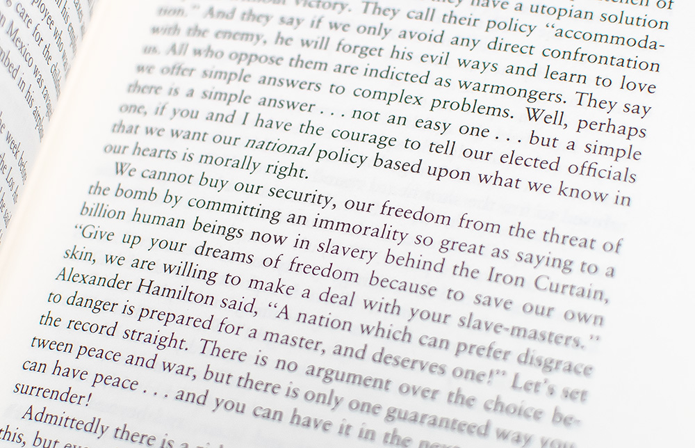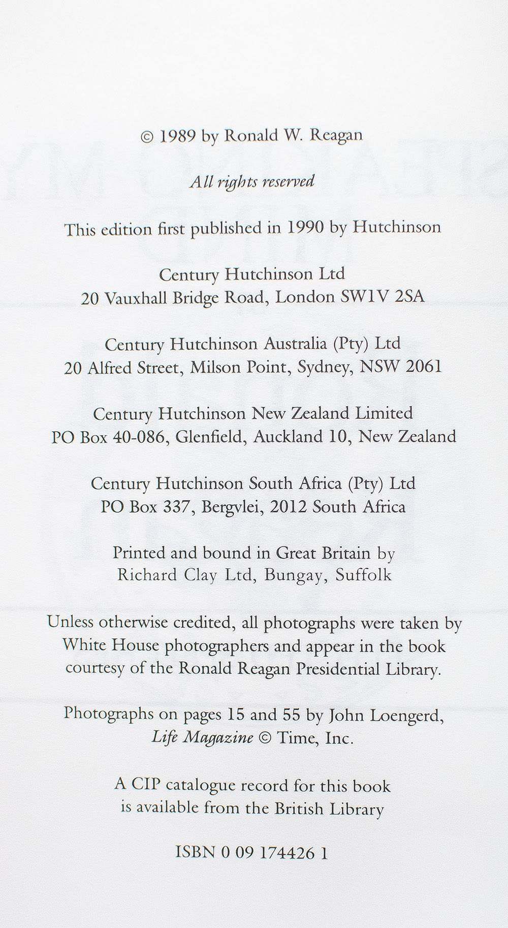 First British edition of President Reagan's collection of speeches. Octavo, original cloth, illustrated with black and white photographs. Boldly signed by the author on the half-title page, "Ronald Reagan Aug. 5 - '92." Near fine in a near fine dust jacket. Jacket design by Alan Dempsey. British editions are rare signed.