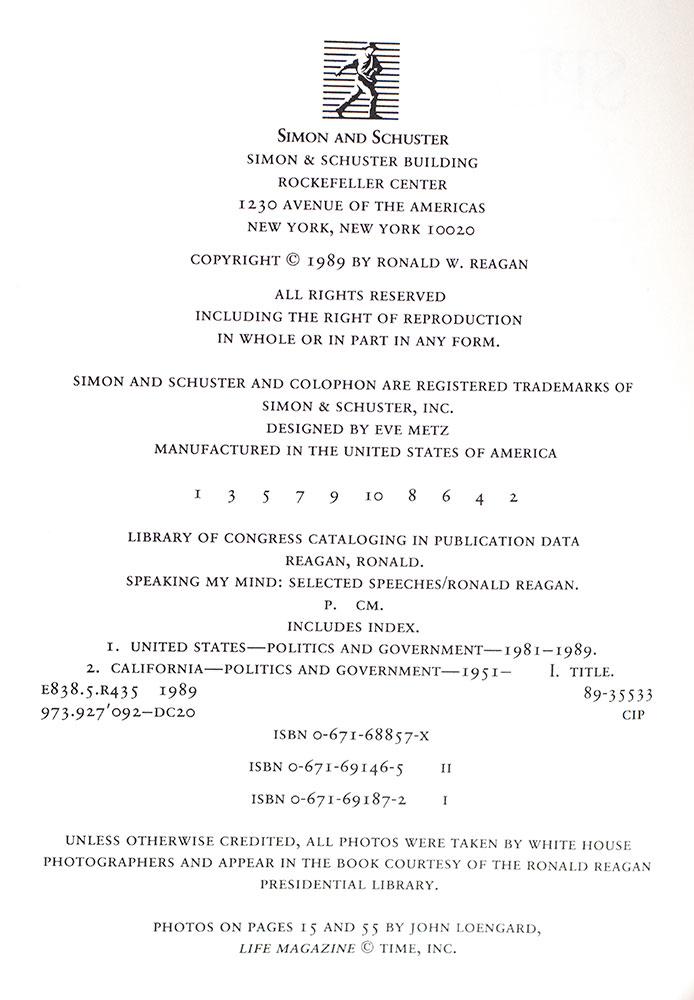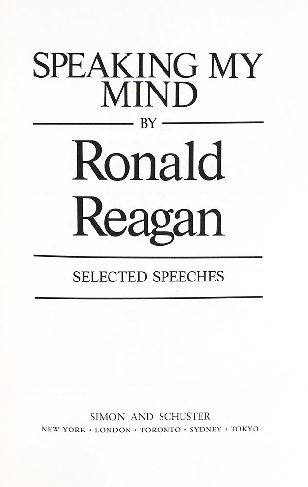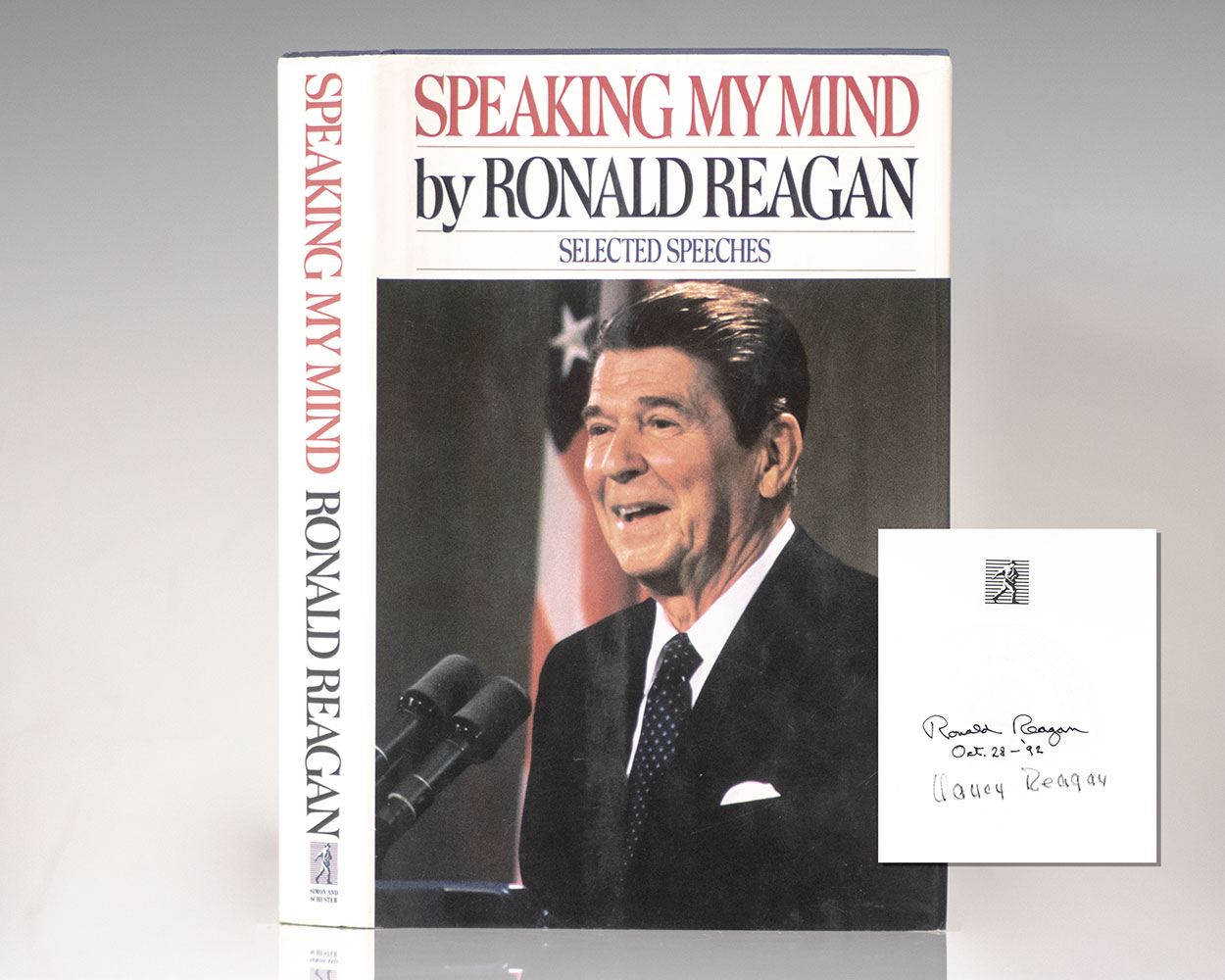 First edition of President Reagan's collection of speeches. Octavo, original half cloth, pictorial endpapers, illustrated. Boldly signed by the author on the half-title page, "Ronald Reagan, Oct. 28-'92" and Nancy Reagan below. Near fine in a near fine dust jacket. Jacket design by Barry Littmann. Desirable signed by both President and First Lady Reagan.