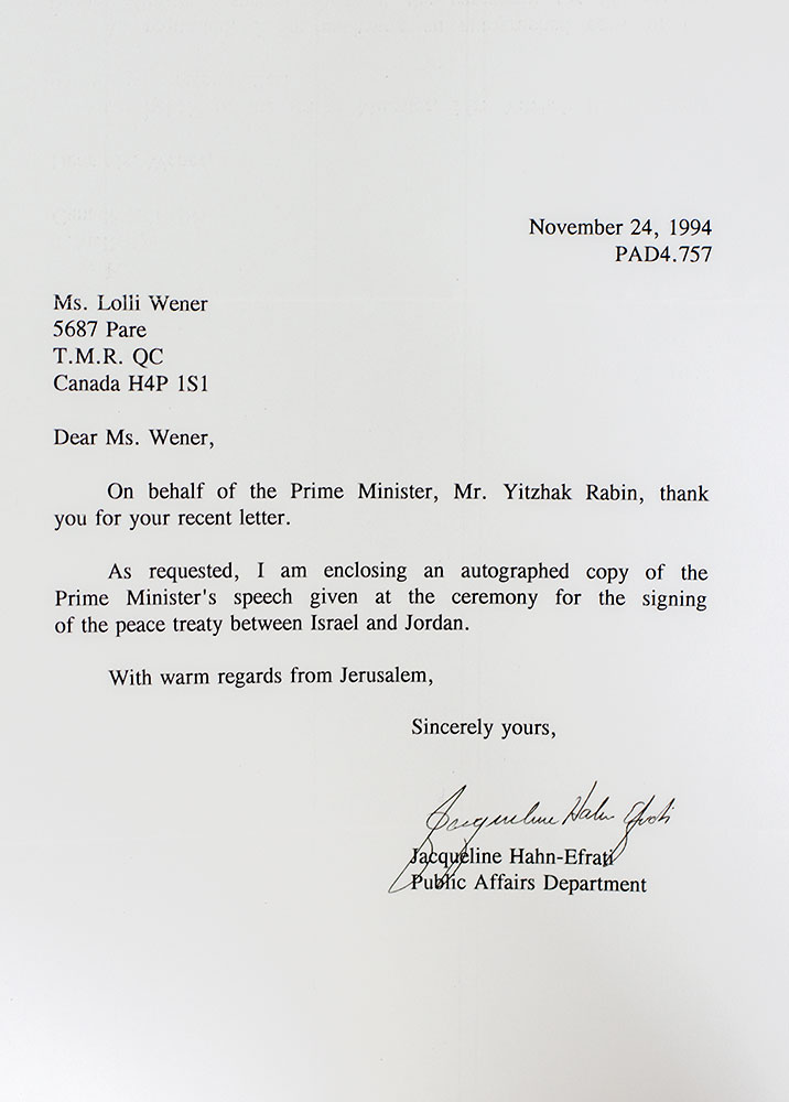 Rare two-page official printing of the speech given by Prime Minister Yitzhak Rabin at the signing ceremony of The Israel–Jordan Peace Treaty. Two pages on Rabin's Prime Minister's office letterhead, signed by Rabin, "Y. Rabin." In fine condition.