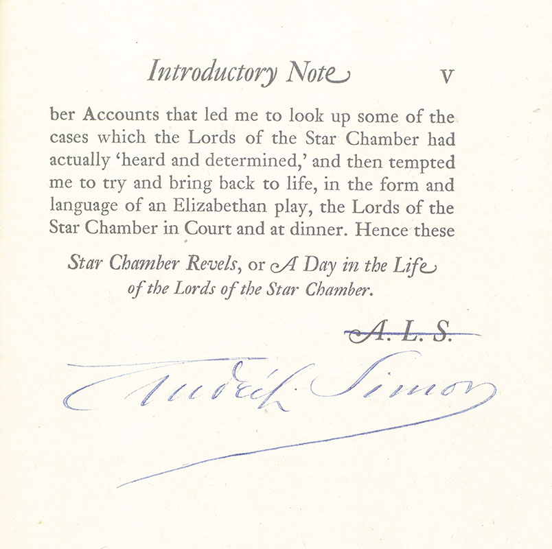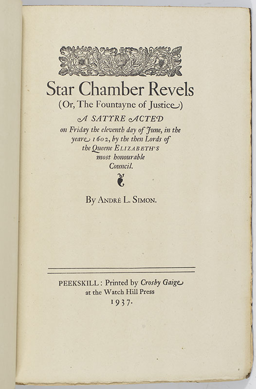 First edition of Star Chamber Revels (Or, The Fountayne of Justice); signed by Andre L. Simon