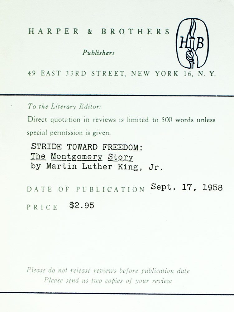 "Nonviolence is directed against forces of evil rather than against persons who happen to be doing the evil. It is evil that the nonviolent resister seeks to defeat, not the persons victimized by evil": First Edition of Stride Toward Freedom: The Montgomery Story; Signed by Martin Luther King, Jr.