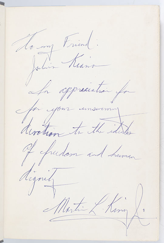 First edition, early printing of Dr. Martin Luther King’s first book. Octavo, original half cloth, illustrated. Association copy, inscribed by the author on the front free endpaper, "To my Friend: Julius Kiano, for appreciation for your unswerving devotion to the ideals of freedom and human dignity Martin L. King Jr." As a young African scholar at the University of California at Berkeley, Dr. Julius Gikonyo Kiano became the first Kenyan to earn a PhD. According to Dorothy Stephens in her 2006 memoir, Kwa Heri Means Goodbye: Memories of Kenya 1957-1959, Kiano dated Coretta Scott, the future wife of Martin Luther King, Jr., for five years. The couple separated due to Scott deeming him ‘too bright’ and ‘too political.’ Near fine in a very good price-clipped dust jacket with light rubbing. Housed in a custom half morocco clamshell and chemise box. An exceptional association.