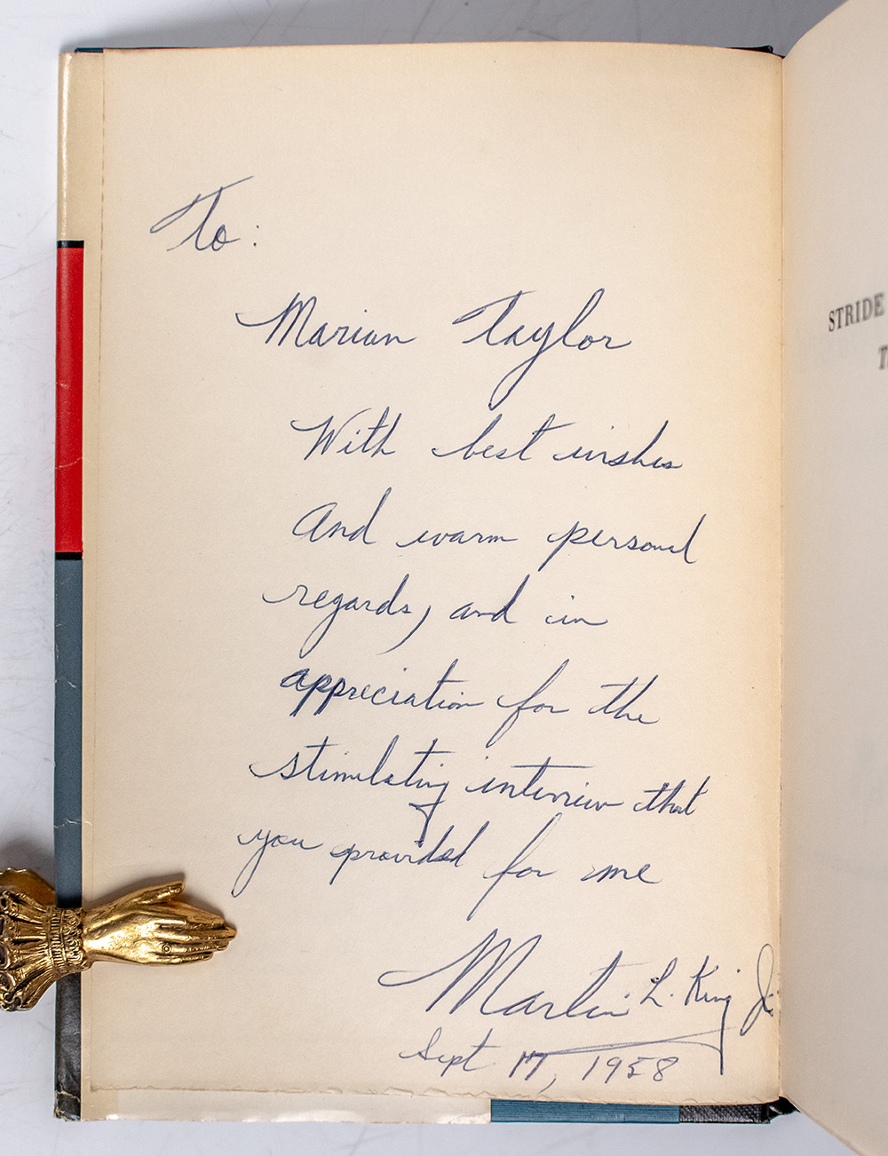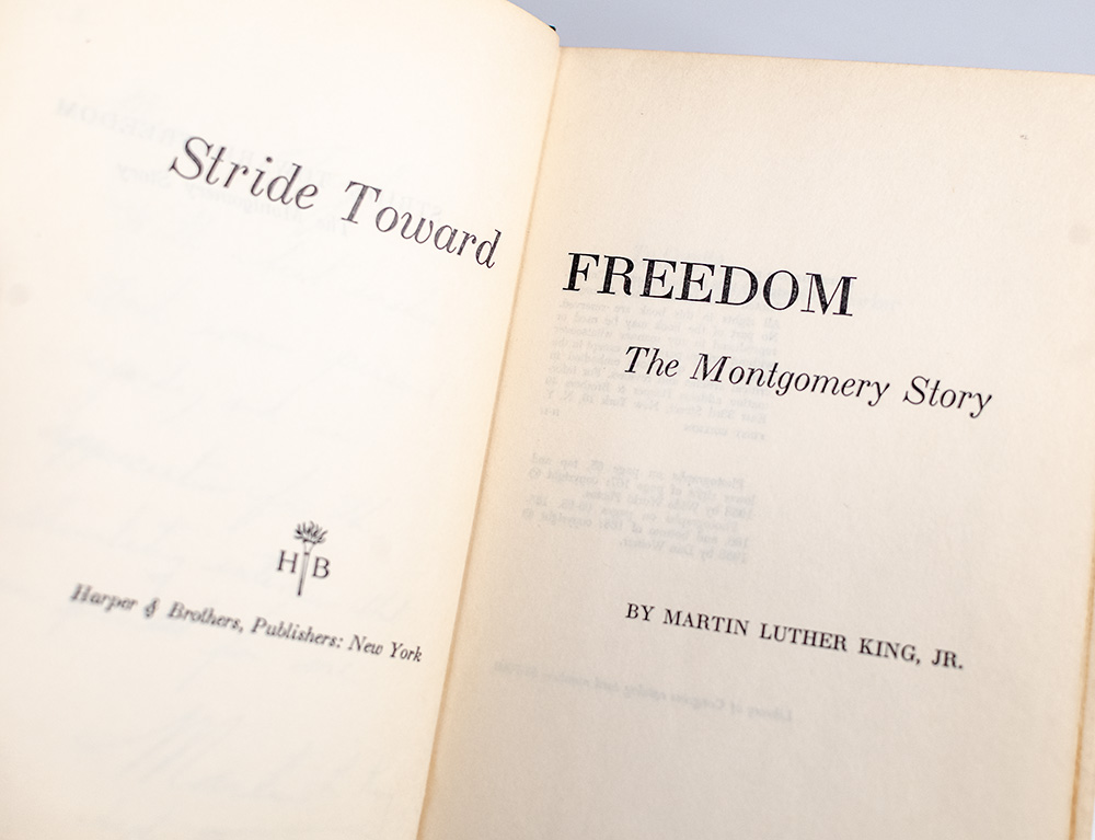 "God is interested in the freedom of the whole human race": First Edition of Stride Toward Freedom: The Montgomery Story; Inscribed by Martin Luther King, Jr. to CBS Radio Interviewer Marian Taylor