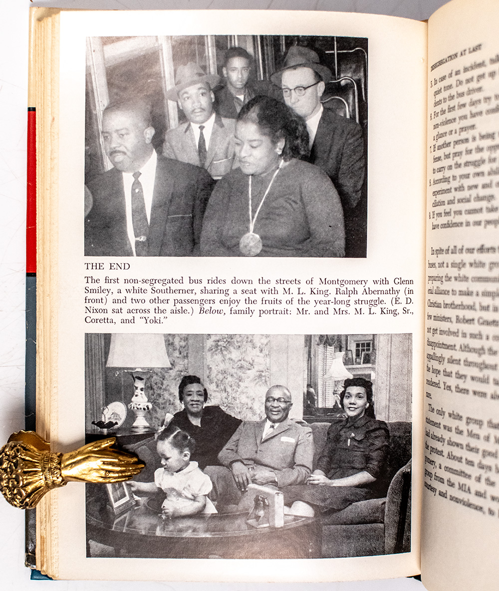 First edition of Dr. Martin Luther King’s first book. Octavo, original half cloth, illustrated. Presentation copy, lengthily inscribed by the author opposite the half-title page, "To: Marian Taylor With best wishes and warm personal regards, and in appreciation for the stimulating interview that you provided for me. Martin Luther King, Sept. 17, 1958." Taylor, under the name Martha Dean, hosted a series of interviews with King on CBS radio. He inscribed this copy shortly after completing a fifteen-minute interview with Taylor on 17 September 1958, which began at 9:45 (as noted by Taylor on the front free endpaper in pencil). Near fine in a near fine dust jacket with paperclip marks to the rear free endpaper. Housed in a custom folding chemise and half morocco slipcase with gilt titles. Rare and desirable signed and with provenance.