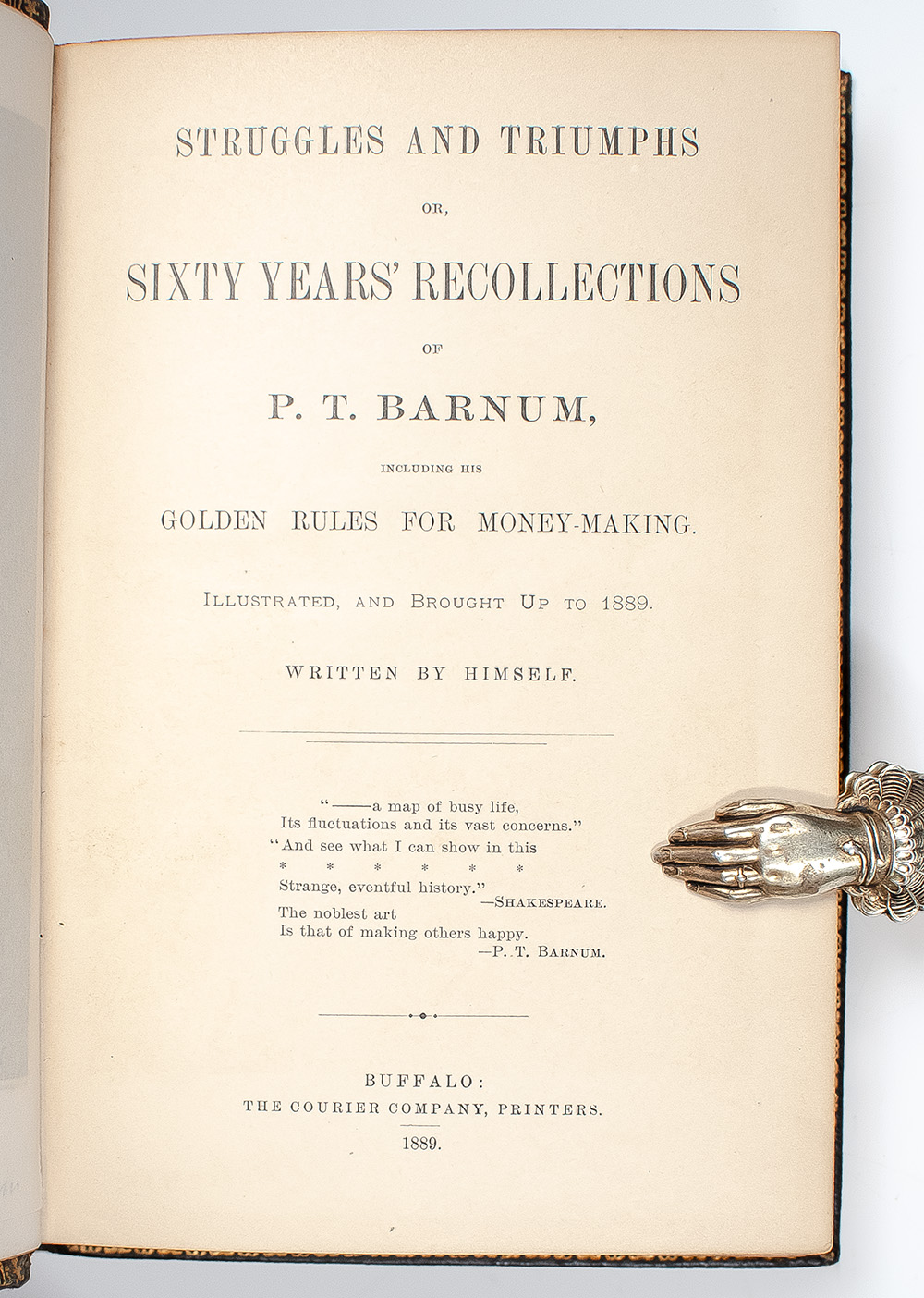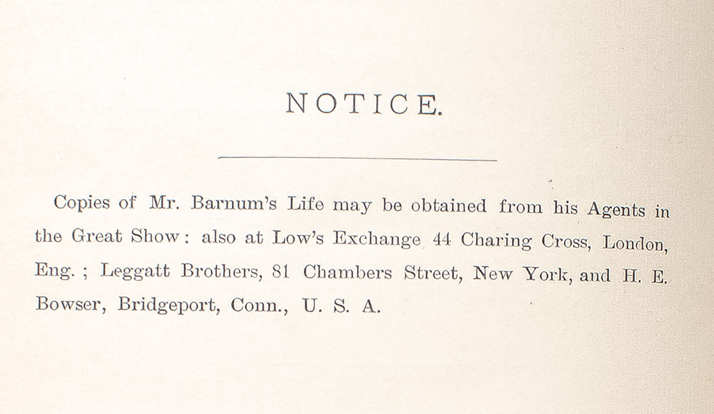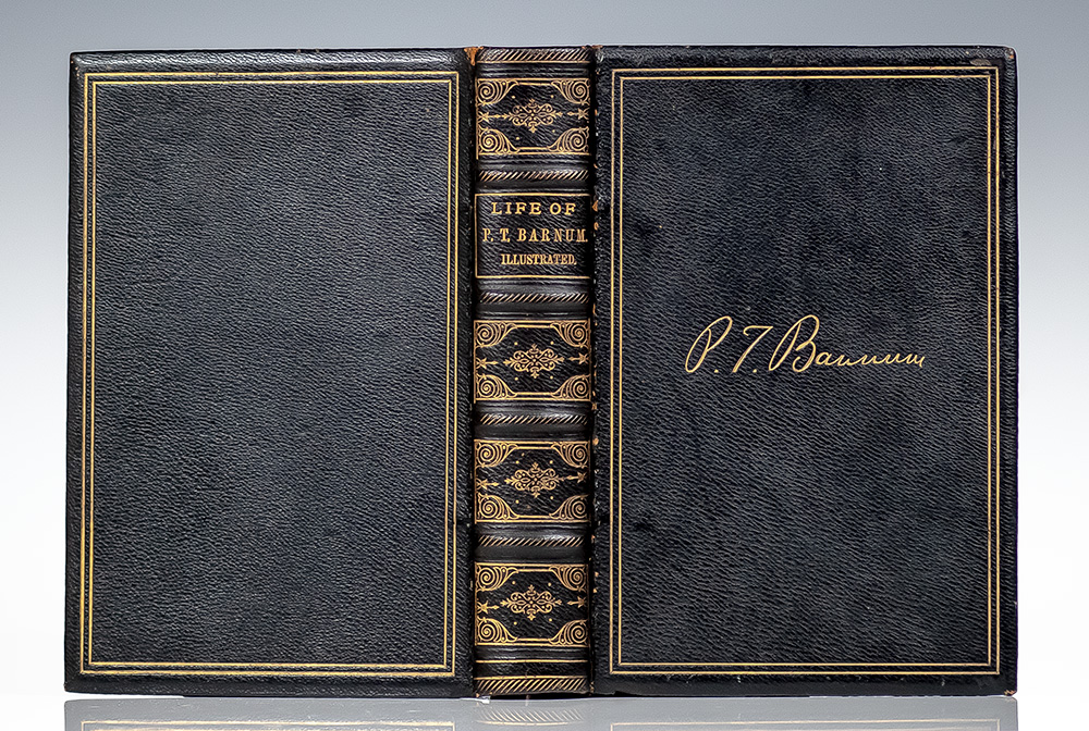 Final and most complete edition of this utterly engaging autobiography. Octavo, bound in full deluxe morocco with gilt titles and tooling to the spine in five compartments within raised bands, gilt ruled borders to the front and rear panel with facsimile signature in gilt to the front panel, gilt turn-ins and inner dentelles, all edges gilt, marbled endpapers, tissue-guarded frontispiece portrait of Phineas T. Barnum, 42 black and white illustrations, many of which are by True Williams, the famed illustrator of 'The Adventures of Tom Sawyer.' In very good condition with some rubbing. An exceptional example.